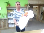 Na třetí neděli v červnu připadl Den otců. Hned následující pondělí jsme na klubovém setkání měli v plánu ty naše taťky přezkoušet z toho základu, a to je přebalení mimina látkovými plenami, obléci ho a zabalit do klasické zavinovačky. Jako by to tušili, raději zůstali doma 😊 Našel se jeden praděda, kterému pomáhala manželka se slovy, v životě to nedělal a pak bezdětní pánové mladšího věku, kteří překvapili, páč věděli a znali! Musíme je všechny pochválit, někteří i bez kontrolky zraku prokázali, že jemná motorika jim není cizí a je to jejich denní chléb 😊 Nechyběla ani zasloužilá odměna ve formě papírové kravaty.