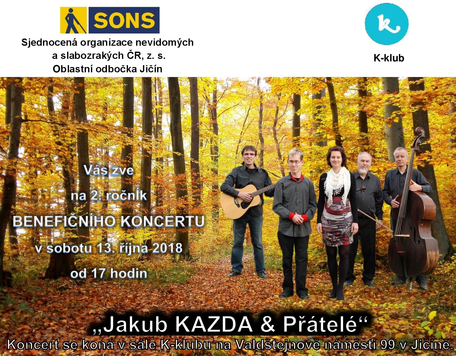 V sobotu 13. 10. 2018 pořádala oblastní odbočka Jičín již druhý ročník benefičního koncertu. Prostor pro akci poskytl K - klub středisko volného času a především paní ředitelka Mgr. Lenka Vacková, od které se organizace těší veliké podpory, a proto ji za SONS ČR, z. s. oblastní odbočka Jičín velice děkuje.