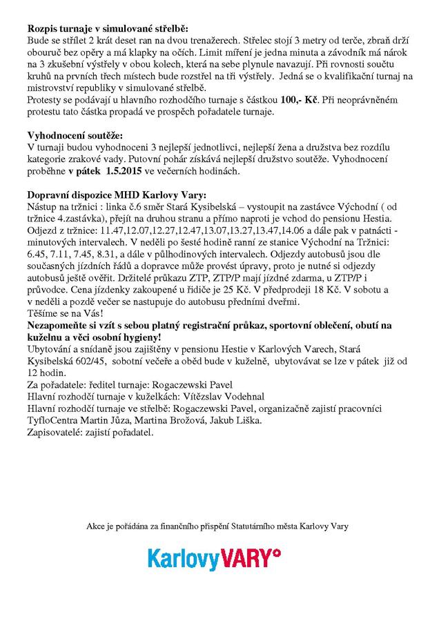 Turnaj v simulované střelbě o lázeňský pohár se uskuteční ve dvou kolech současně, která na sebe budou navazovat na dvou různých střelnicících. Zahájení proběhne v pátek 1.5.2015 od 14.30 hodin ve společenské místnosti penzionu Hubertus.
