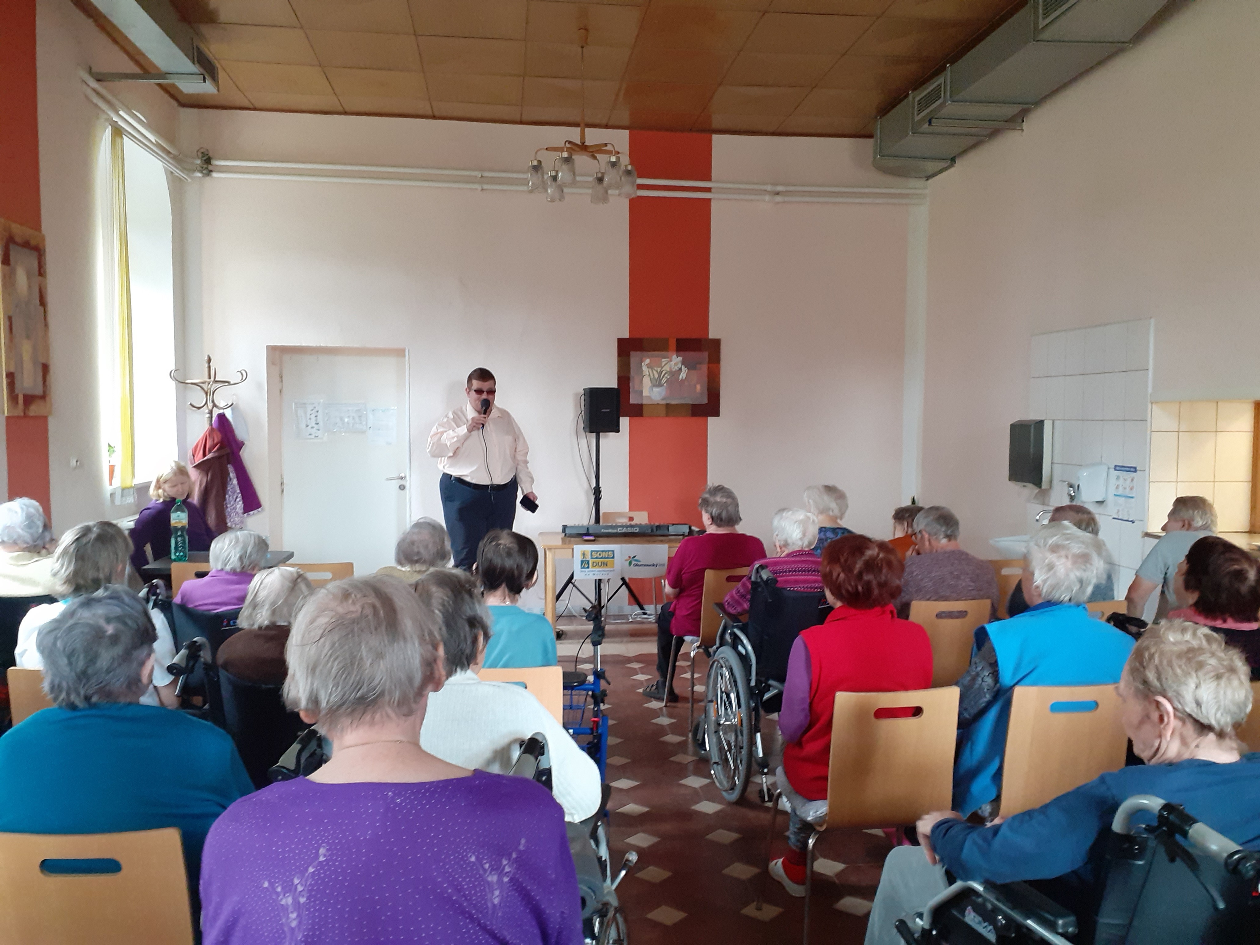 Ve čtvrtek 29. 9. v 10 h. nás přivítalo milé a početné publikum Domova pro seniory v Javorníku. Klienti i zaměstnanci domova měli možnost zaposlouchat se do autorských písní napsaných přímo pro Radka, písní českých velikánů i tradičních lidovek. Závěr vystoupení patřil písničkám na přání, do jejichž zpěvu se zapojilo mnoho přítomných. Dojetím ukápla nejedna slzička. Radkovo hodinové vystoupení bylo odměněno bouřlivým potleskem. Osobní poděkování a focení se „zpěvákem z televize“ nebralo konce.
