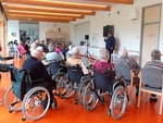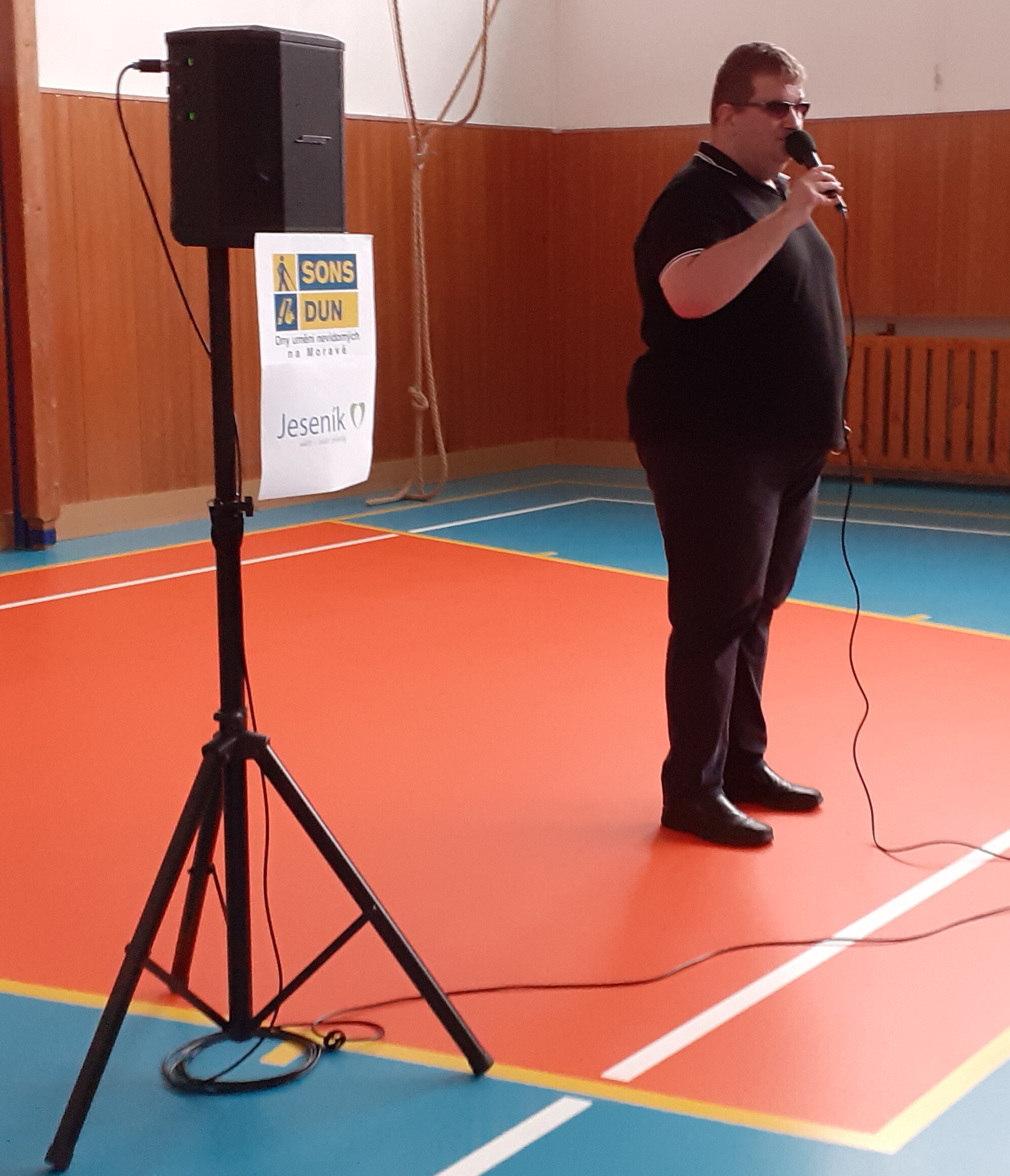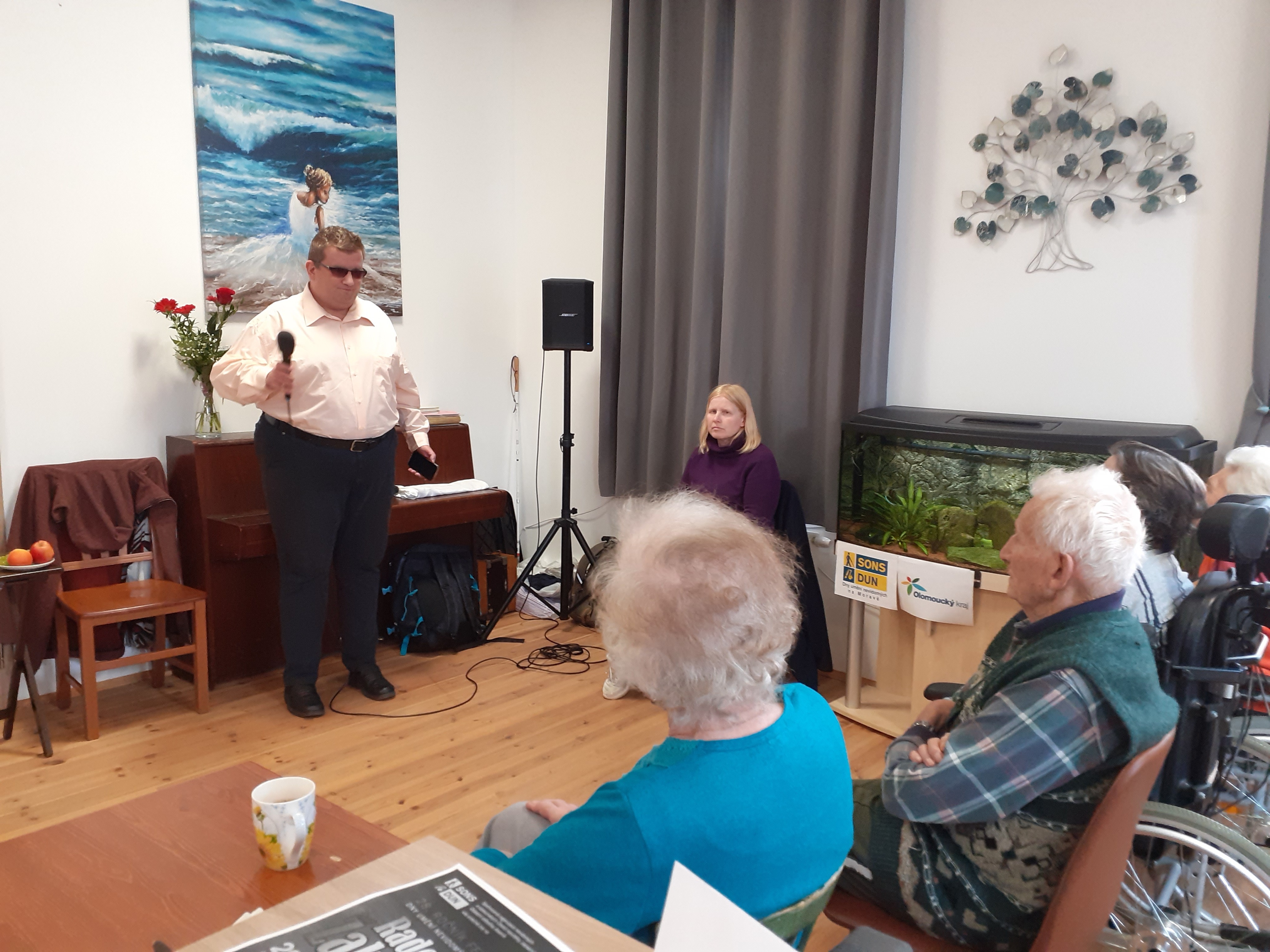 Po nezbytné pauze na oběd jsme se přesunuli do Domova seniorů Centra sociálních služeb v Jeseníku. Ve 14.30 h. se domovem rozeznělo hodinové pásmo písní různých žánrů i autorů. K mnohým se klienti přidávali svým zpěvem nebo vytleskáváním rytmu. Radkovo vystoupení bylo odměněno bouřlivým potleskem. Po velmi vydařeném koncertě byl Radek ještě chvíli k dispozici a přítomným zodpovídal nejrůznější dotazy. Tohoto koncertu se zúčastnili i členové jesenické odbočky SONS.