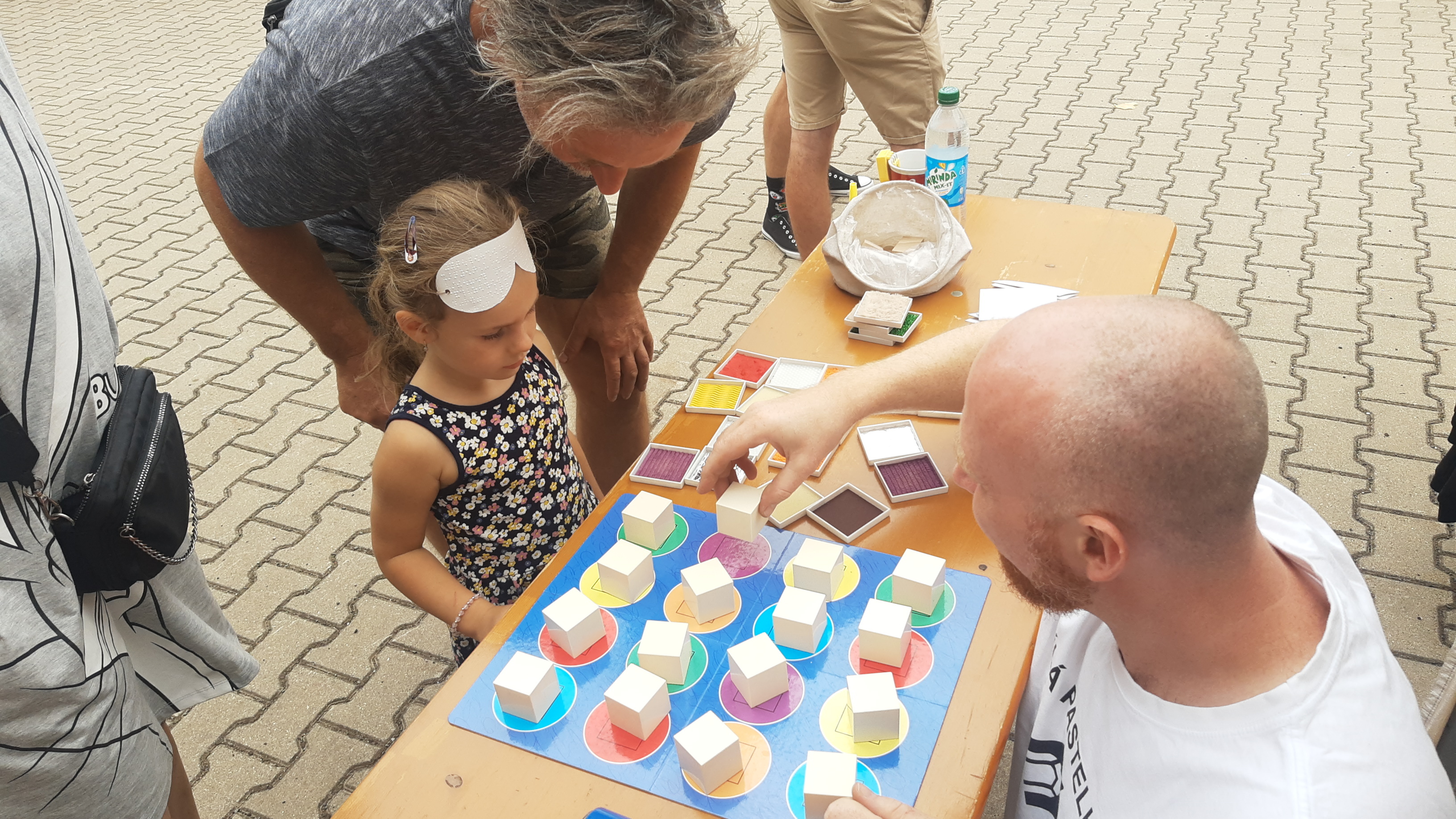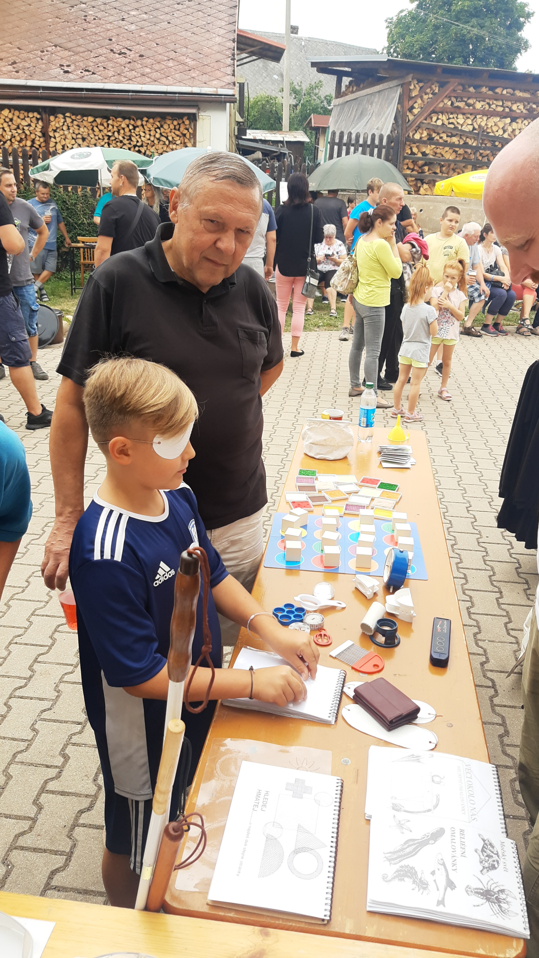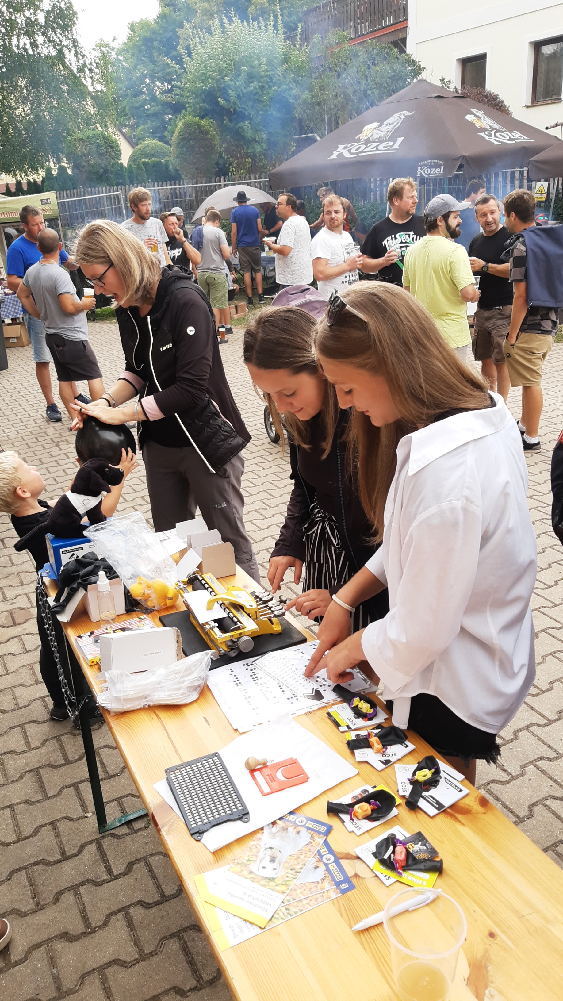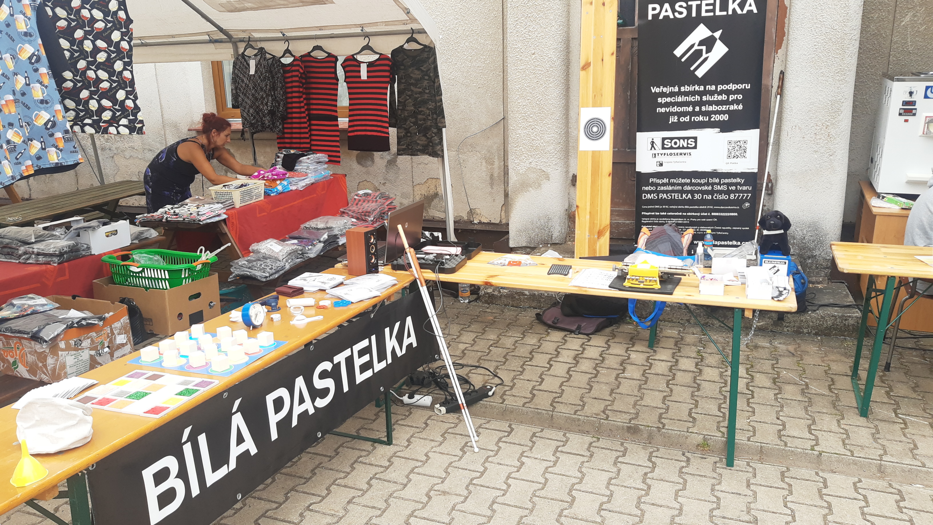 Začátek akce a soutěže byl letos posunut na půl dvanáctou a my jsme mezi soutěžícími spatřili nám známe týmy z minulých let. Rozprostřeli jsme stánek blíže občerstvení a dál od pódia, než jsme měli loni. I přesto byl ruch velký a nebylo moc prostoru pro chůzi s bílou holí.