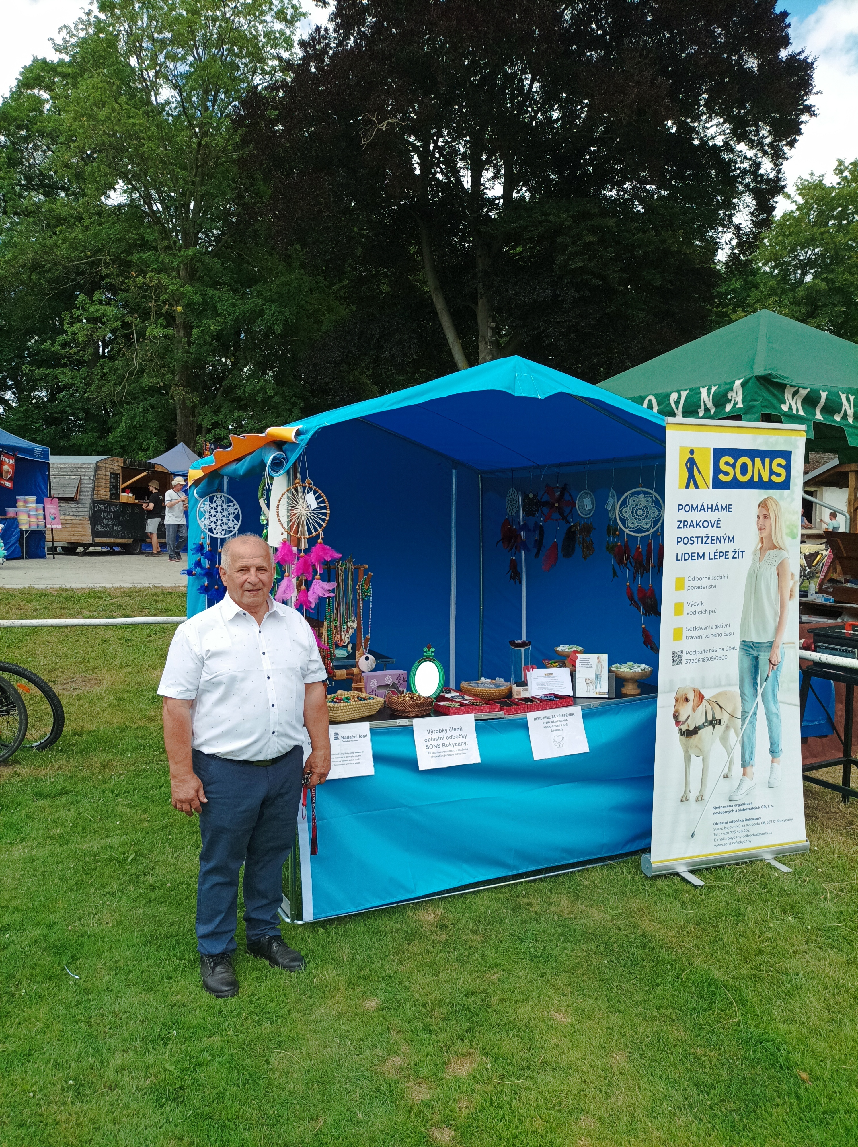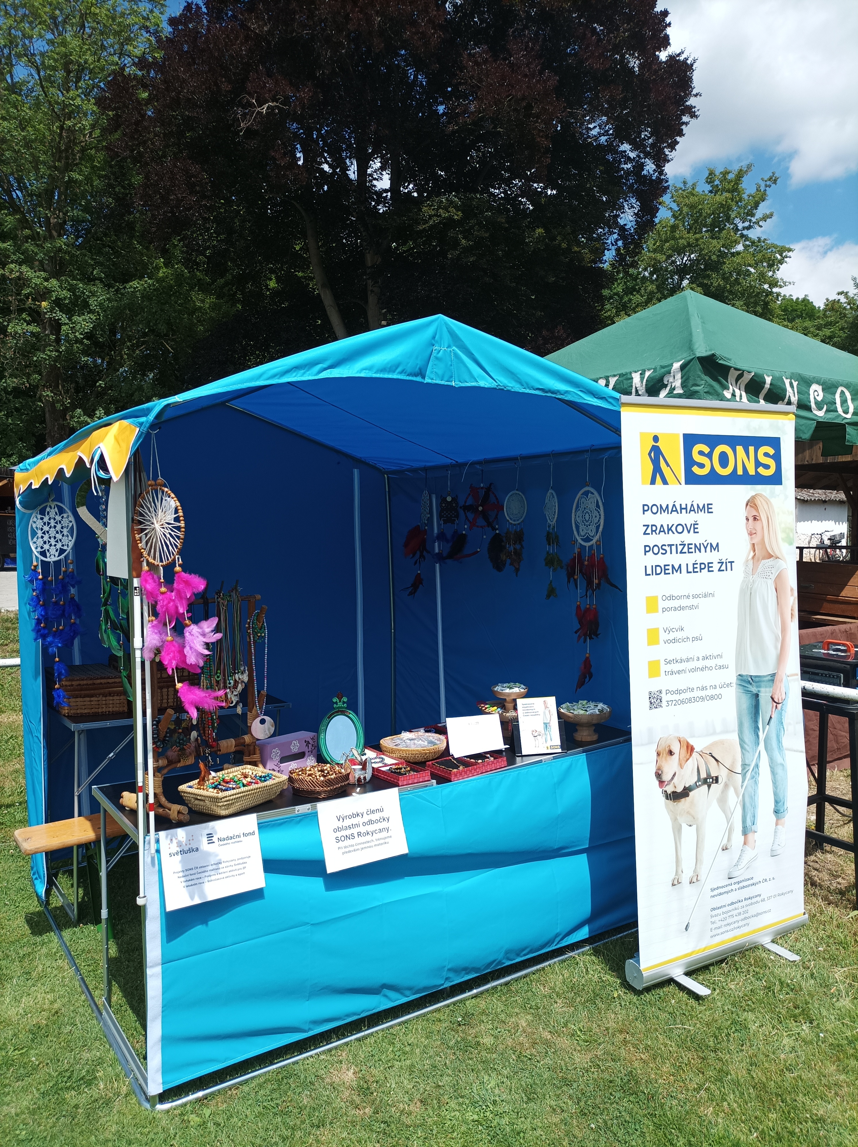 Premiéra našeho nového stánku na oslavách 700 let obce Dobřív.Na fotografii je zachycen náš zbrusu nový prezentační stánek, se kterým jsme se poprvé představili veřejnosti při slavnostech v Dobřívě dne 28. června 2025. Pod modrým přístřeškem jsou vystaveny ručně vyráběné výrobky členů oblastní odbočky SONS Rokycany – náramky, korálkové šperky, lapače snů i další tvořivé dekorace. Vedle stánku nechybí informační banner SONS, který představuje naši činnost a služby pro osoby se zrakovým postižením. Stánek sloužil nejen k prezentaci výrobků, ale především jako místo pro setkávání s veřejností, poskytování informací a zvyšování povědomí o světě osob se zrakovým znevýhodněním. Děkujeme všem, kdo se u nás zastavili, a těšíme se na další akce, kde s novým stánkem rozhodně nebudeme chybět!
