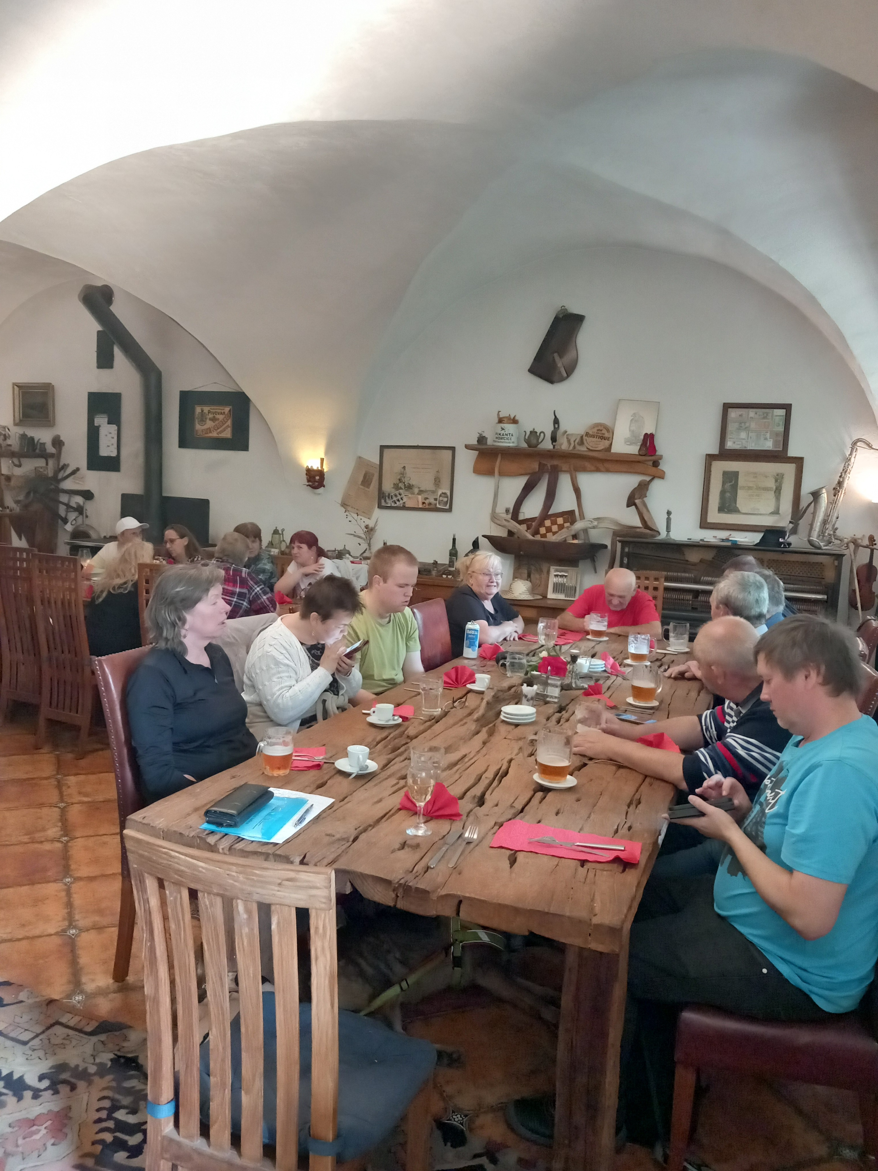 Na obědě jsme byli v krásných starobylých prostorách penzionu pod hradem, jmneuje se to tu Holubník statečných žen králových a moc se nám tam líbilo a chutnalo nám.