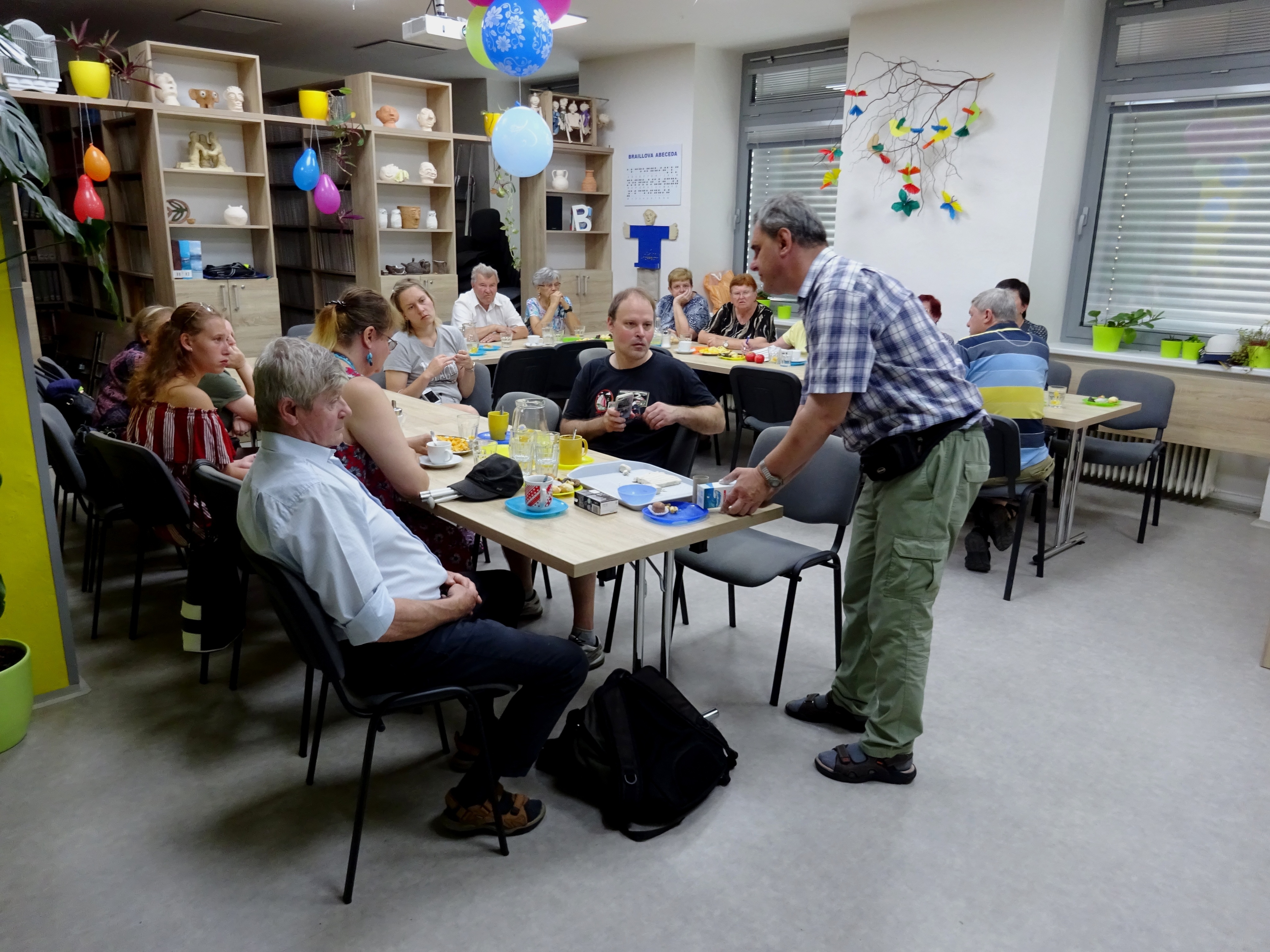 A nejen to, následně jsme pro naše členy na klubovém setkání uspořádali besedu, na které nám František popsal a názorně předvedl jak se s hmatovými hady pracuje a my na obřím plátně dataprojektoru představili jeho výrobky v časové posloupnosti. Opět jsme dali příležitost, aby si naši členové odprezentovali, jak svůj handicap zvládají nejen v každodenním životě, ale jak jej dokáží využít k zhmotnění svých různorodých dovedností, v tomto případě na poli uměleckém.