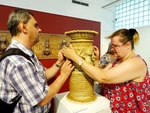 A právě zde, v Uherském Hradišti, probíhala plně haptická výstava pro vidomé i nevidomé, absolventů ATM, s názvem Podoby vína. Jelikož náš člen je jedním ze žáků Axmanovy školy a na této výstavě měl svá díla, byl to důvod výstavu navštívit v jeho doprovodu a od něj si nechat popsat, jak vznikají z hmatových hadů umělecká díla inspirovaná vínem - jeho chutí a vůní.