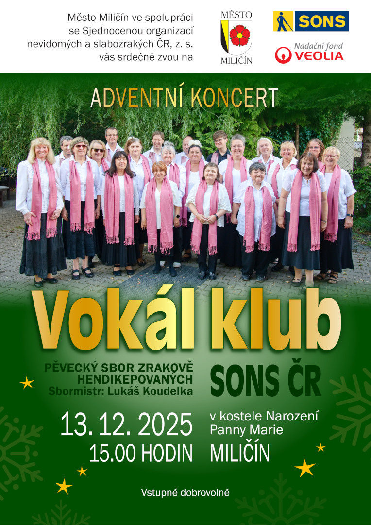 Město Miličín ve spolupráci se Sjednocenou organizací a slabozrakých ČR, z. s. vás srdečně zvou na adventní koncert Vokál klubu. Koncert se bude konat v kostele Narození Panny Marie v Miličíně dne 13. 12. 2025 od 15 hodin.