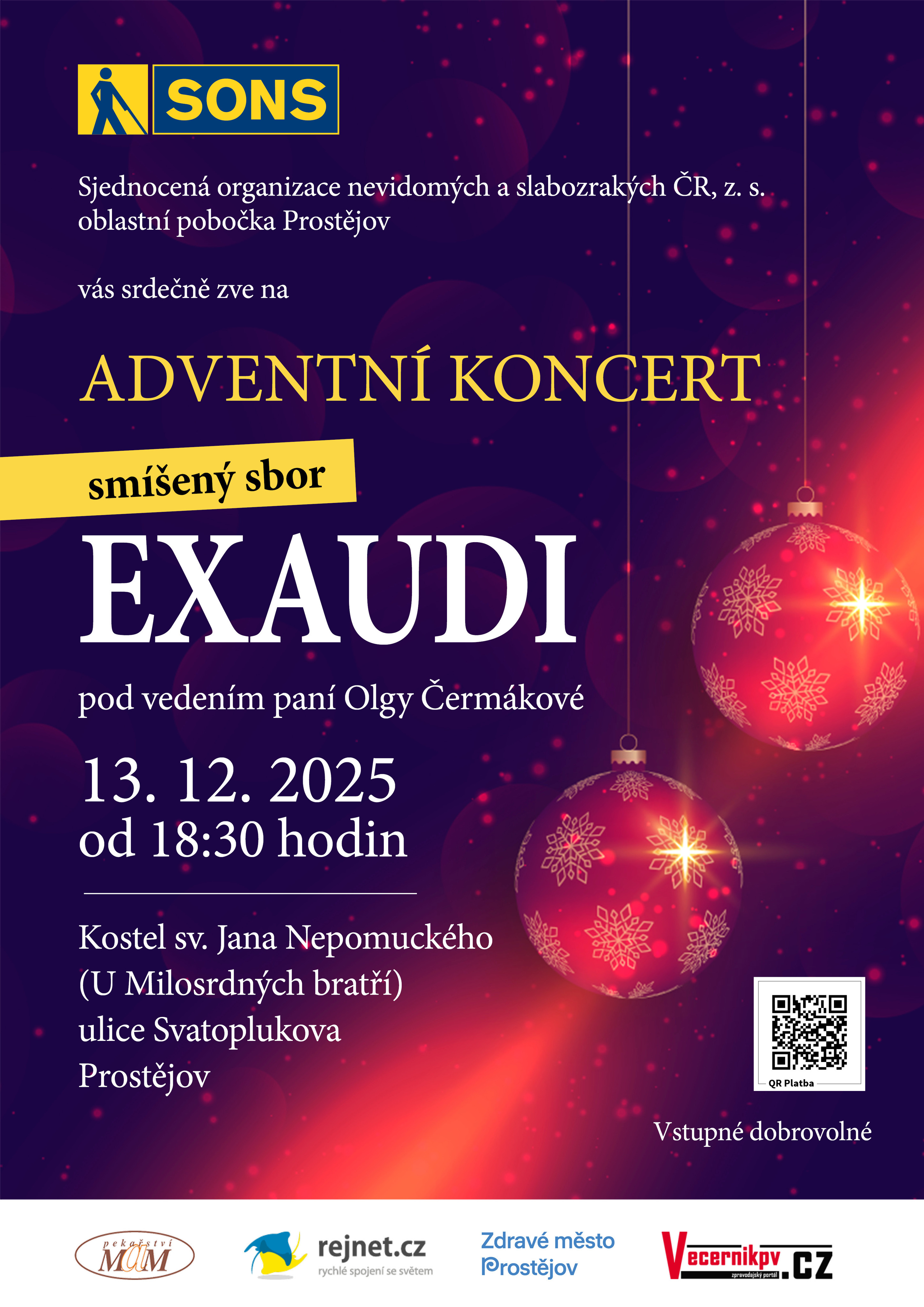 Srdečně zveme všechny příznivce a milovníky hudby na tradiční adventní koncert komorního sboru EXAUDI, který se uskuteční 13. 12. 2025 od 18:30 hod v kostele Sv. Jana Nepomuckého (U Milosrdných bratří) na ulici Svatoplukova v Prostějově.