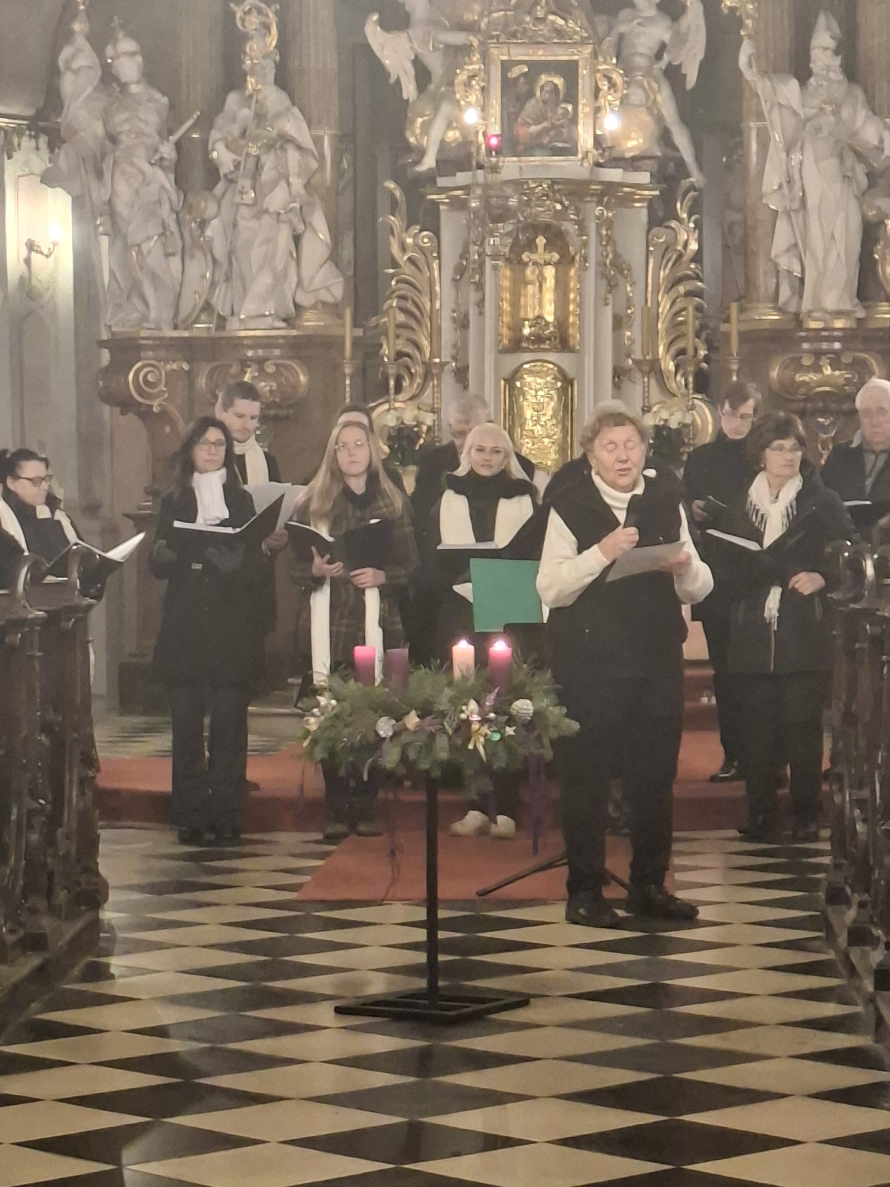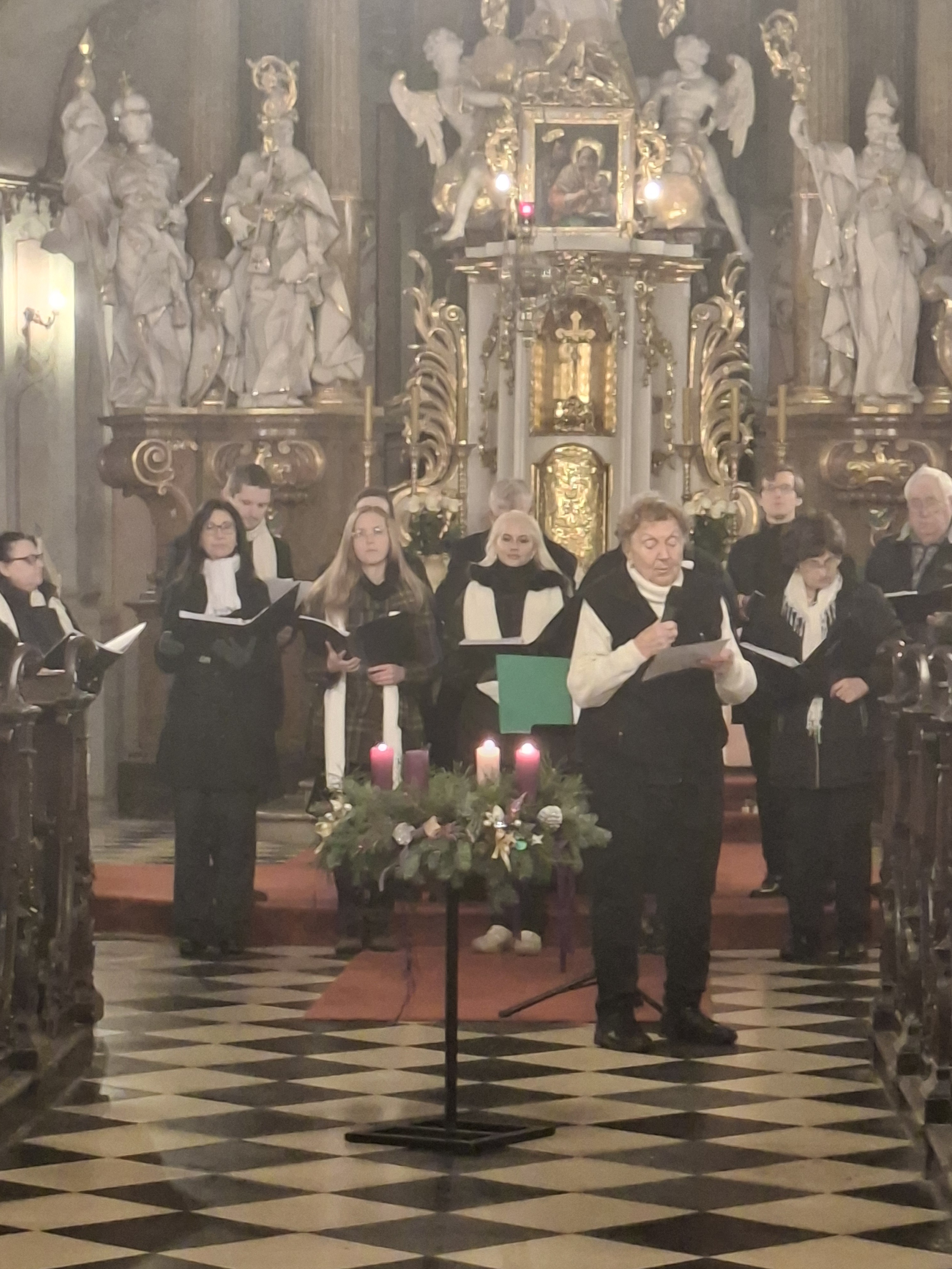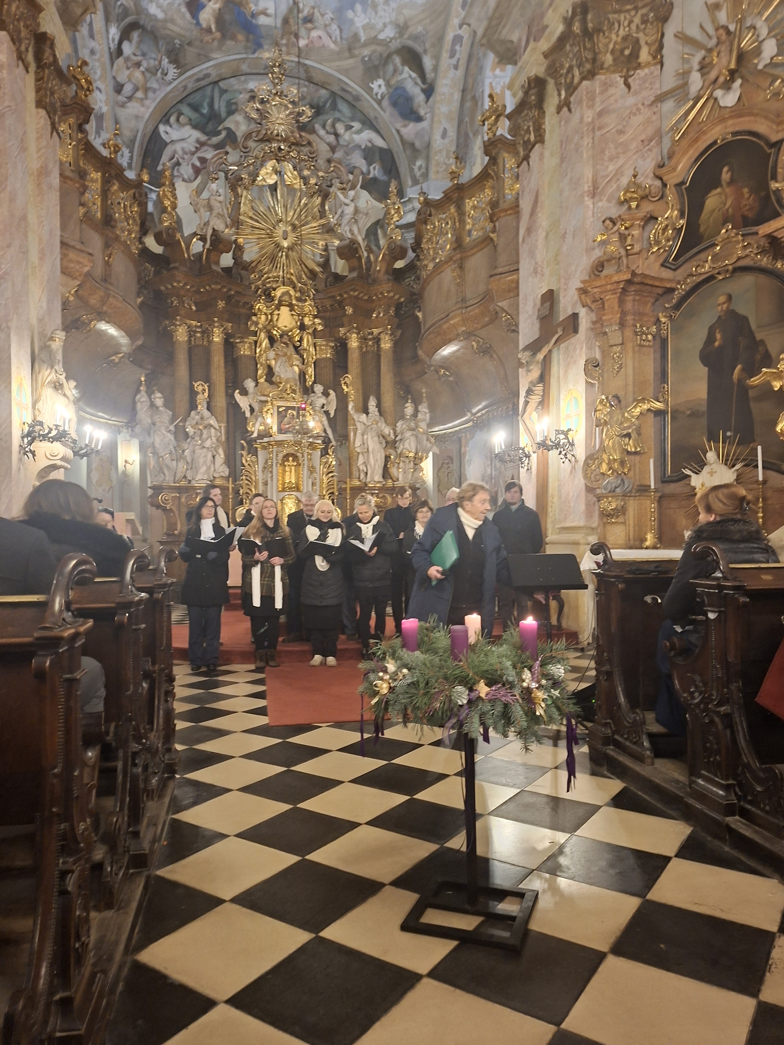 V sobotu 13. 12. 2025 jsme se setkali v kostele, kde pro příchozí návštěvníky hrál a zpúíval sm,íšený komorní sbor EXAUDI. Zážitek to byl velkolepý, sbor vytvořil velmi příjemnou atmosféru. Návštěvníci kostel zaplnili do posledního místečka a do naší pokladny přispěli formou dobrovolného vstupného velmi pěknou finanční částkou.
