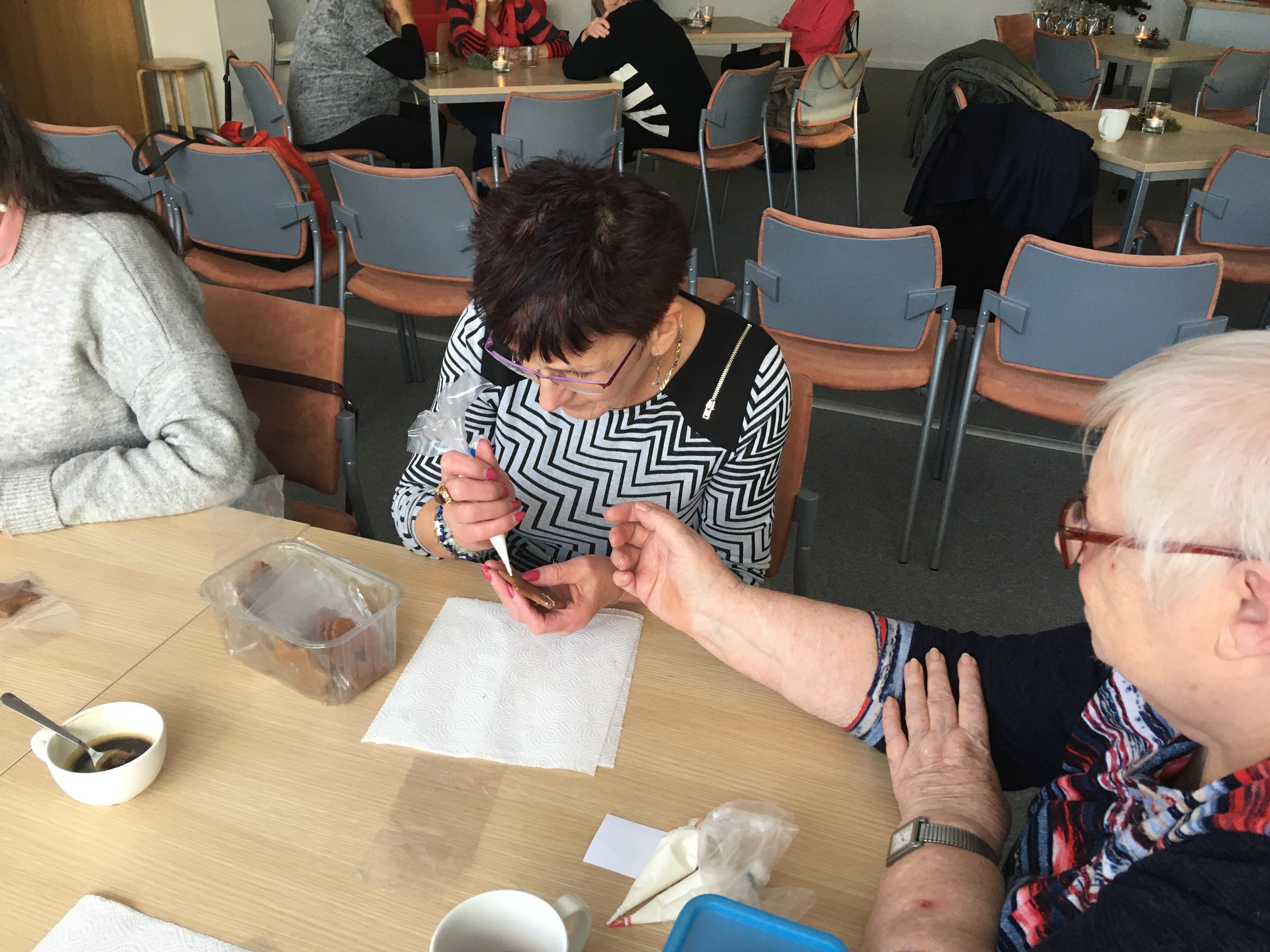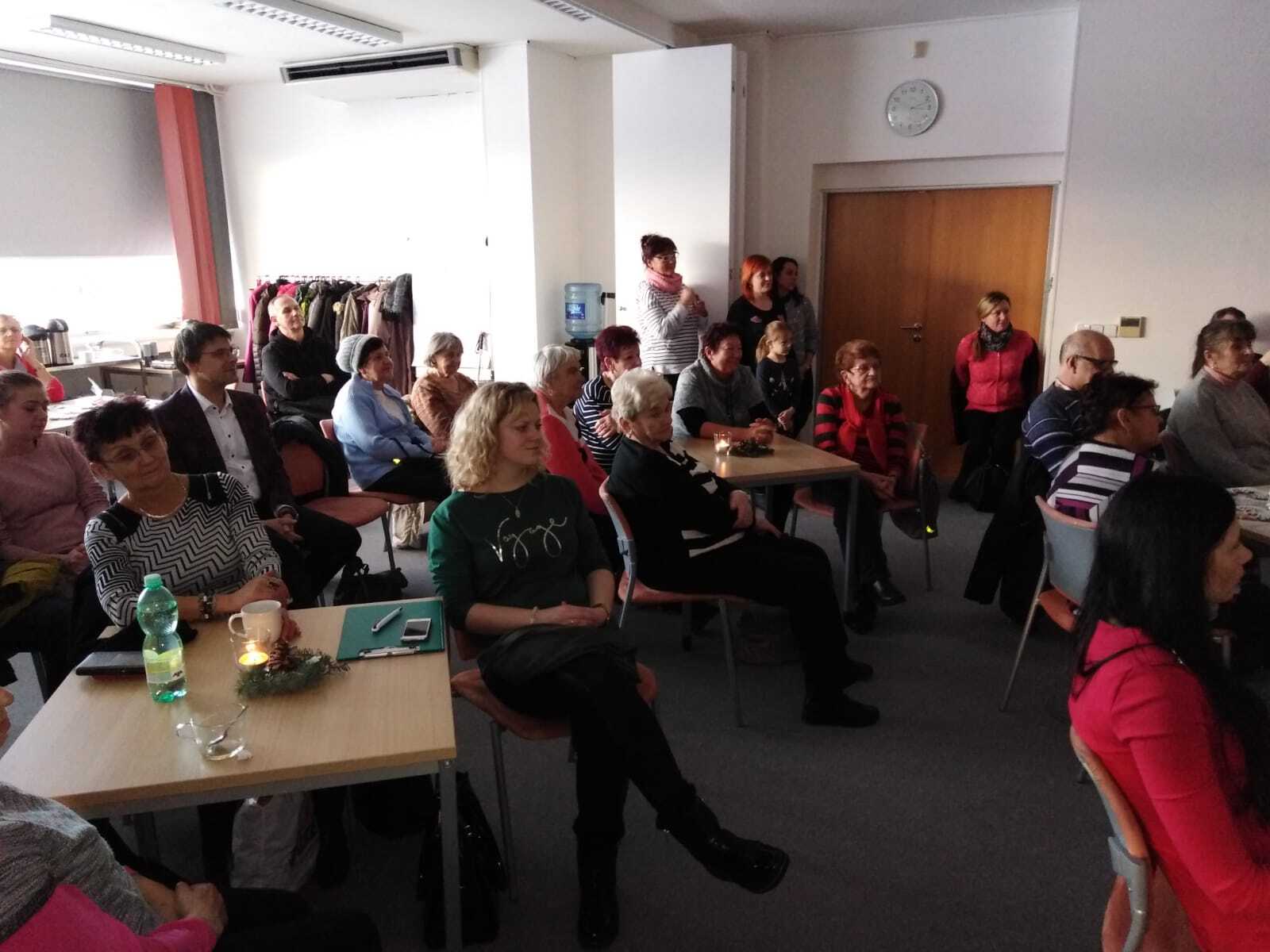 13. prosince jsme se sešli s našimi členy a uživateli služby ve společenském sále Masarykovy veřejné knihovny ve Vsetíně. V tomto adventním čase jsme ocenili bohatý program. Zdobili jsme perníčky a další ozdoby s vánoční tématikou. Naše členka Jiřina Žáčková přinesla různé tvary upečených vánočních perníčků, které jsme si pod jejím dohledem zdobili dle své fantazie. Zároveň si přítomní mohli zakoupit její překrásné výrobky např. chaloupky, zvířátka, zvonečky, PF apod. Po skončení zdobení následoval program pravidelné zvukové knihovny. Vystoupil pěvecký sbor Trávníček při ZŠ Tvárníky. Zazněly koledy, písničky a vyprávění o vánočních zvycích. Všichni jsme ocenili sborový zpěv a další vystoupení milých dětí z pěveckého sboru, se kterým jsme si vánoční koledy oživili a zazpívali.