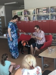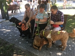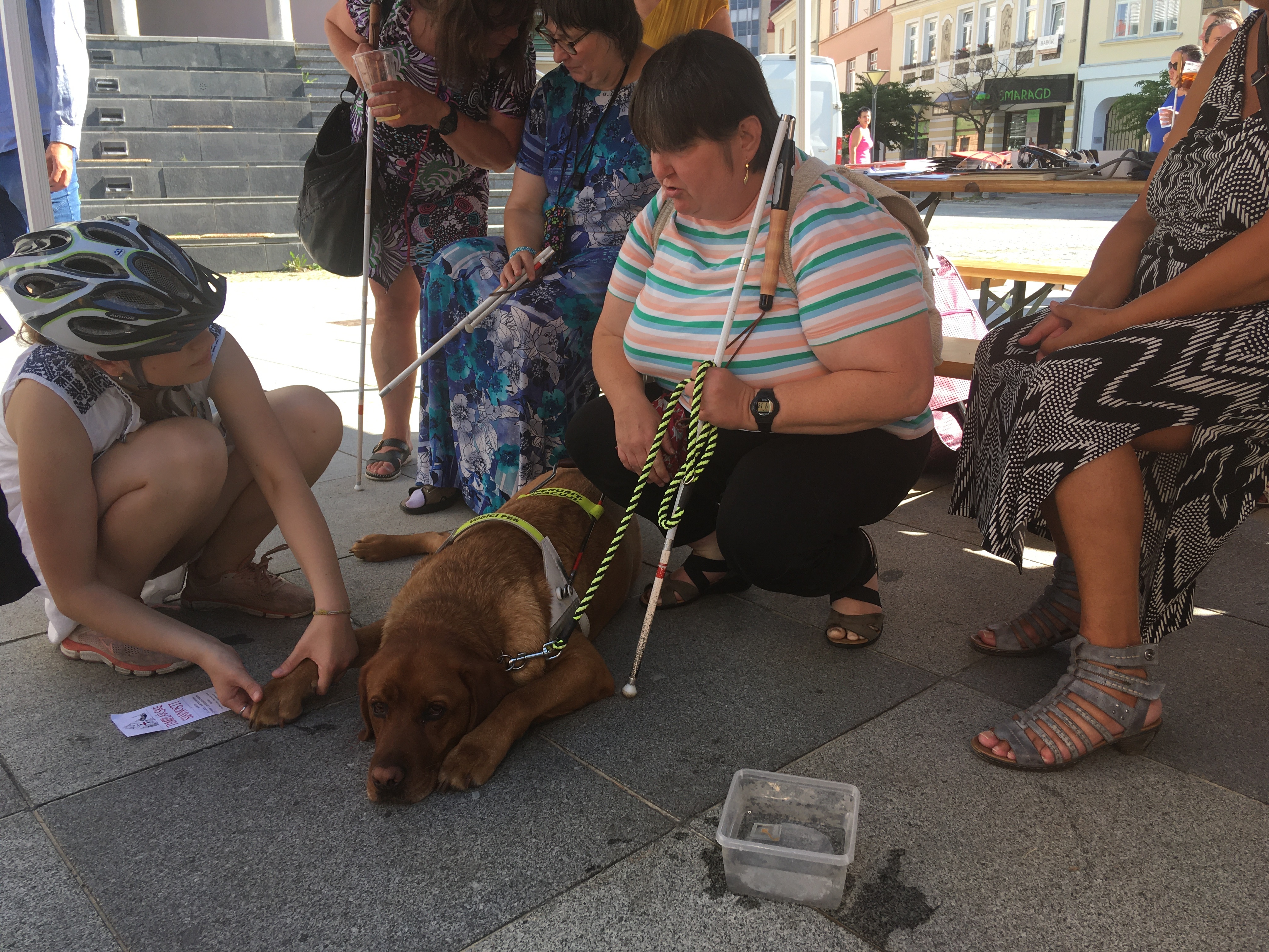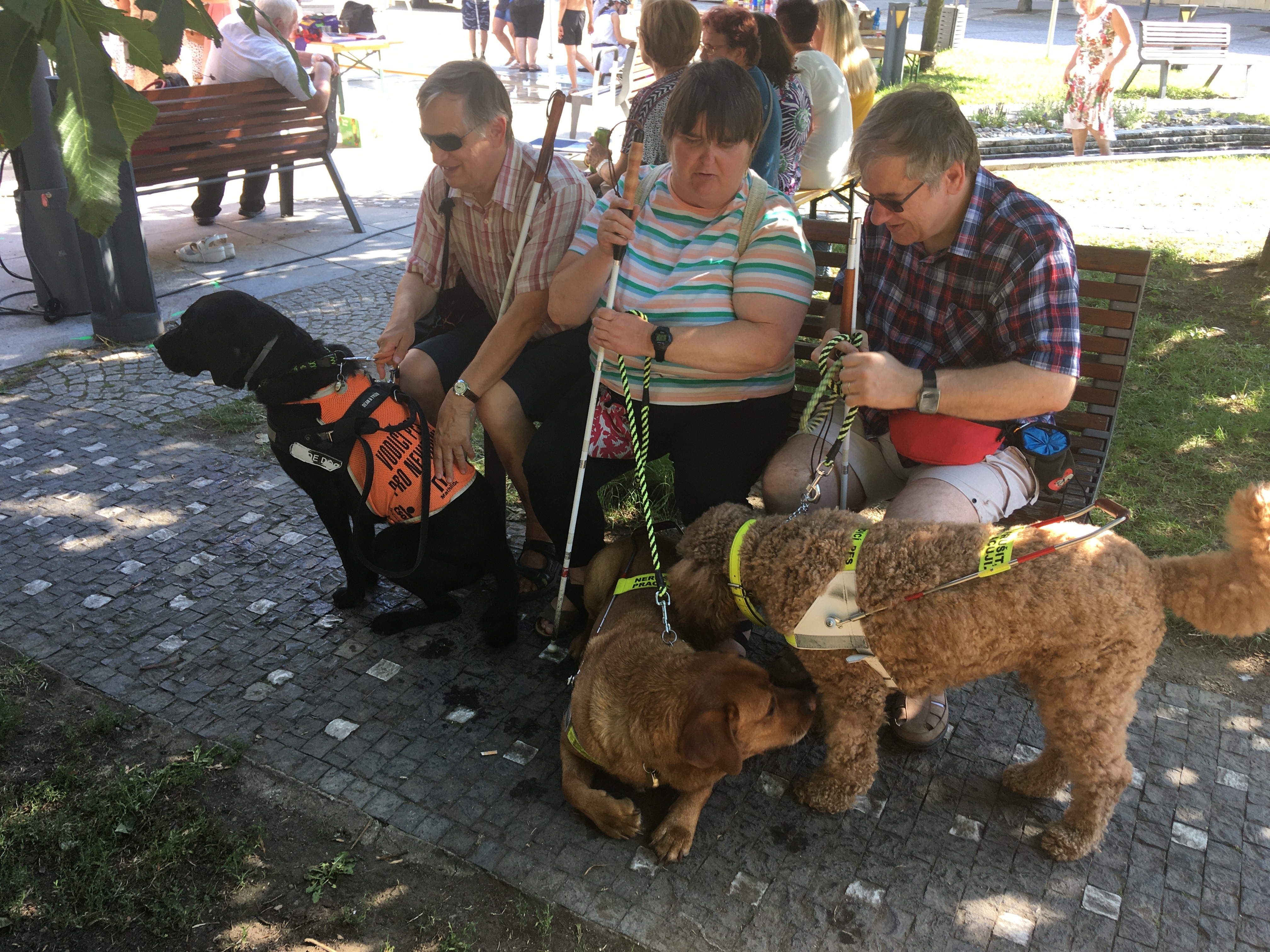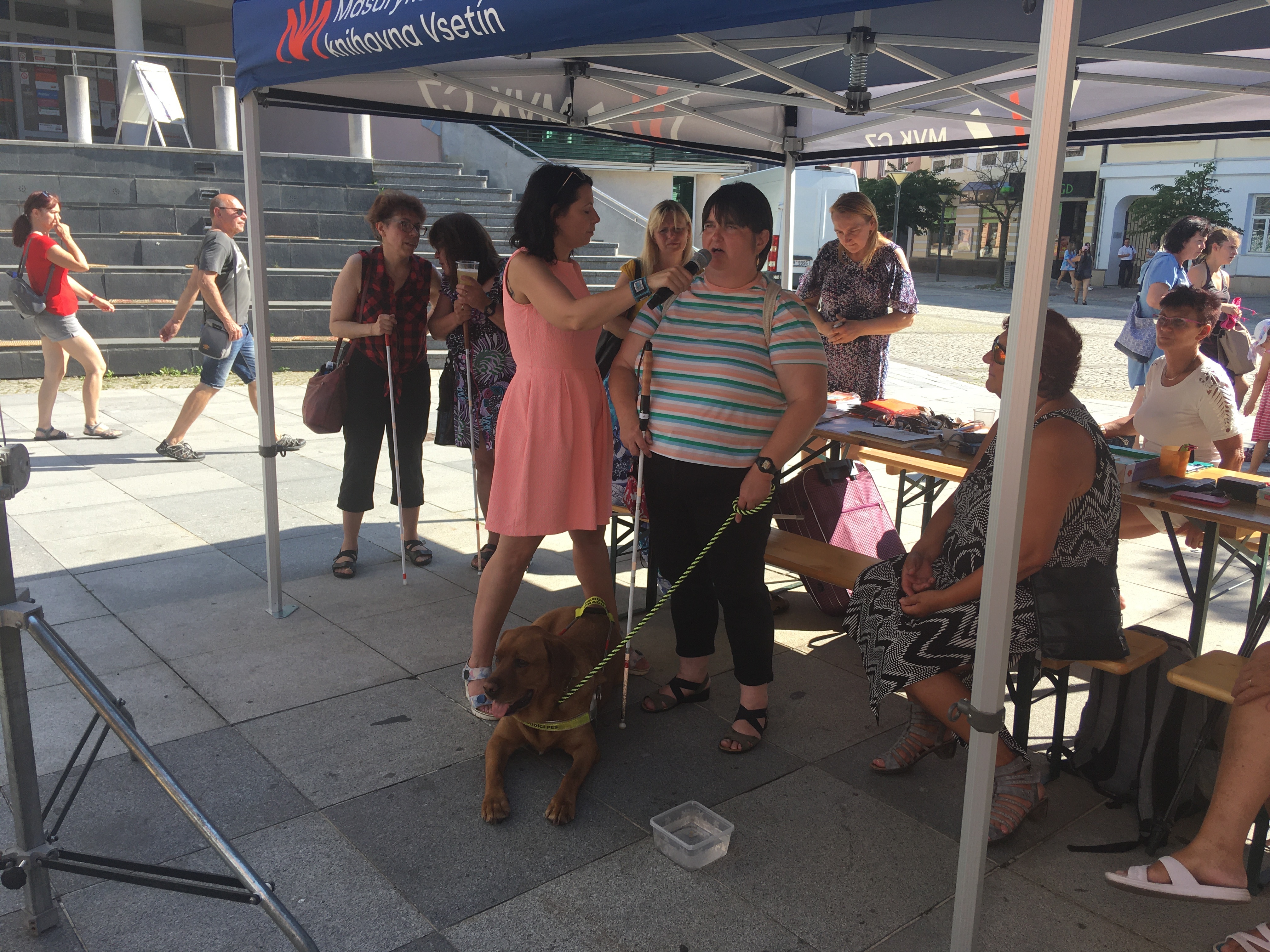 Na náměstí před knihovnou se mezitím připravilo podium a stánky, v nichž se v horkém odpoledni odehrávalo představení pomůcek pro život nevidomých vsetínské odbočky SONS a vsetínské knihovny. Dorazili další vodící pejsci se svými pány či paničkami a všichni se shlukli do stínu pod koruny stromů a na sluníčku defilovali vodící pejsci se zvukovým komentářem moderátorky. Návštěvníci se zvědavě dotazovali na život s vodícím pejskem a potěšil nás zájem o zakoupení knížky Stanislavy Krajíčkové, která do knížek vepisovala své věnování.