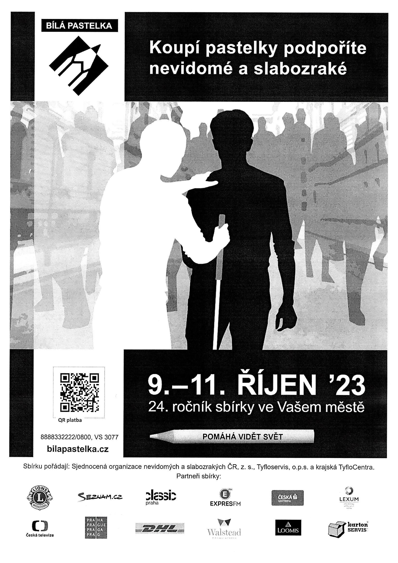 Letošní 24. ročník sbírky Bílá pastelka proběhne ve dnech 9. - 11. října po celé republice. Jako každý rok budou dobrovolníci v ulicích města nabízet bílé pastelky a kalendáře ve tvaru pastelky, s cílem finančně podpořit služby pro lidi se zrakovým postižením. Sbírkové kasičky jsou vybaveny QR kódem pro možnost bezkontaktní platby. Výtěžek sbírky je určen na dofinancování speciálních služeb pro nevidomé a slabozraké v rámci celé České republiky – např. na pomoc s návratem do běžného života lidem, kteří přišli o zrak v dospělosti, zaměstnávání lidí se zrakovým postižením, nácvik chůze s bílou holí, výcvik vodicích psů, výuku práce s počítačem se speciálním programem, apod. Více na www.bilapastelka.cz. Pořadatelem sbírky je Sjednocená organizace nevidomých a slabozrakých České republiky, zapsaný spolek. Děkujeme za vaši podporu!