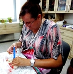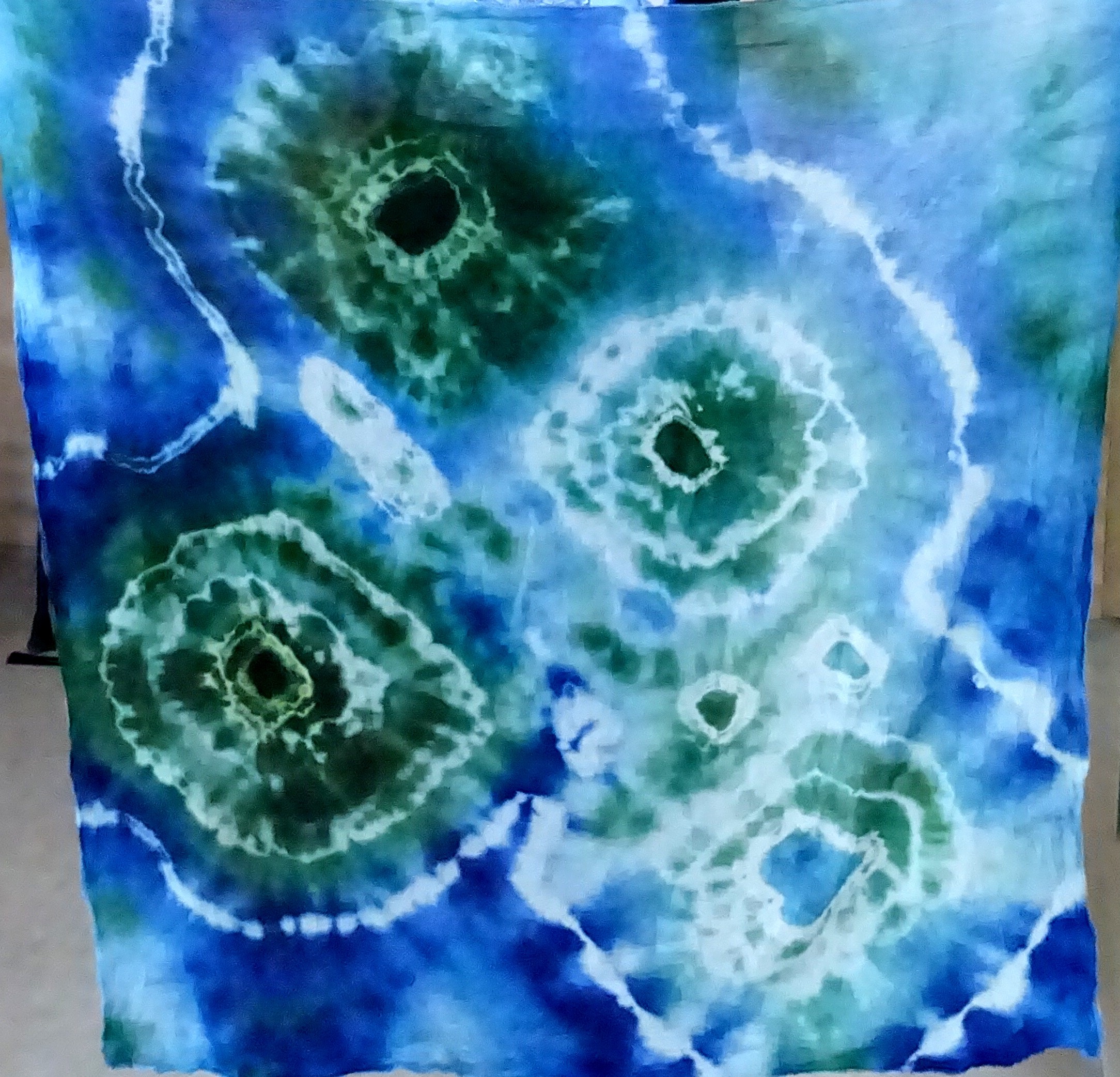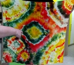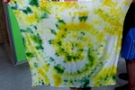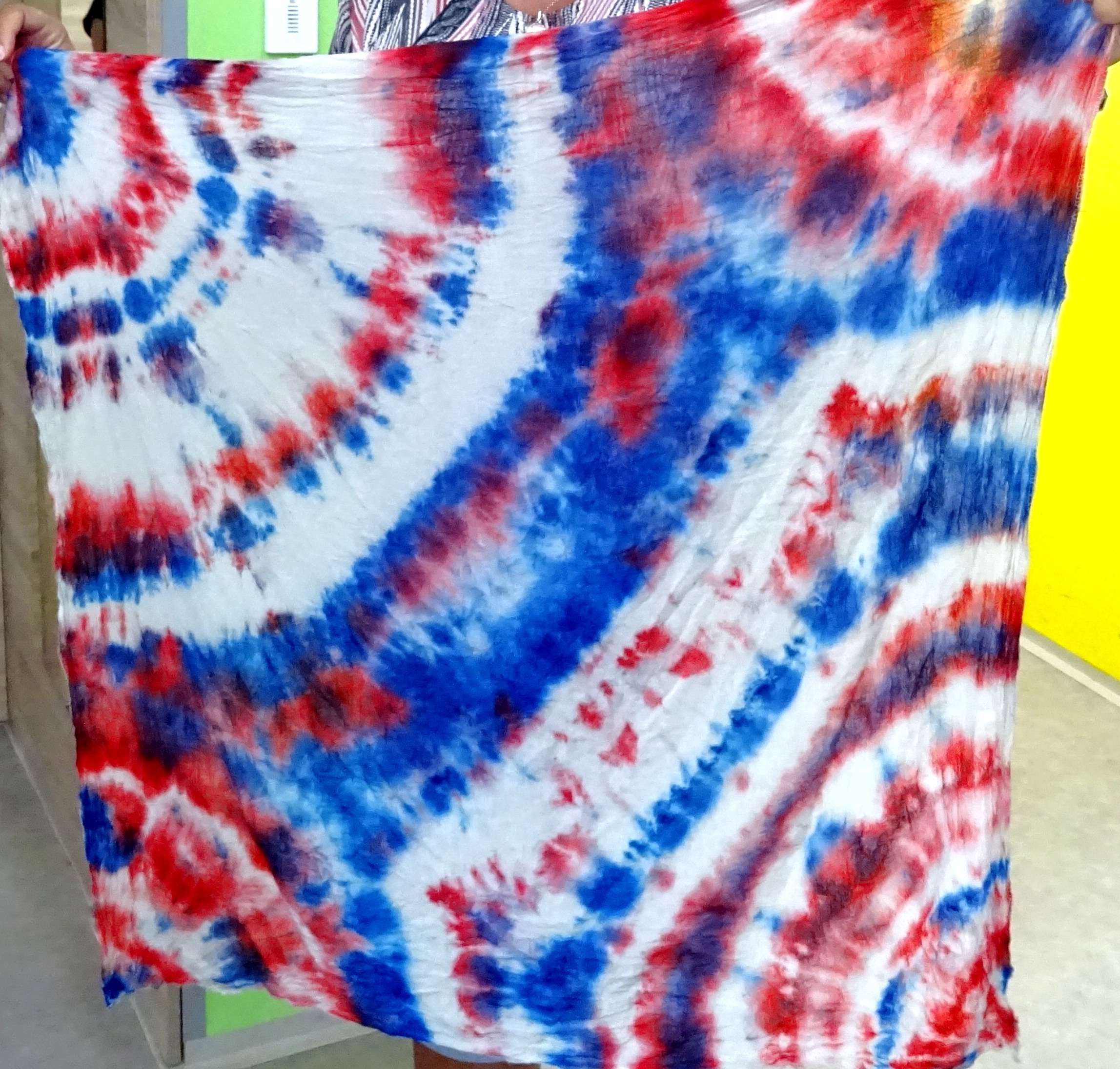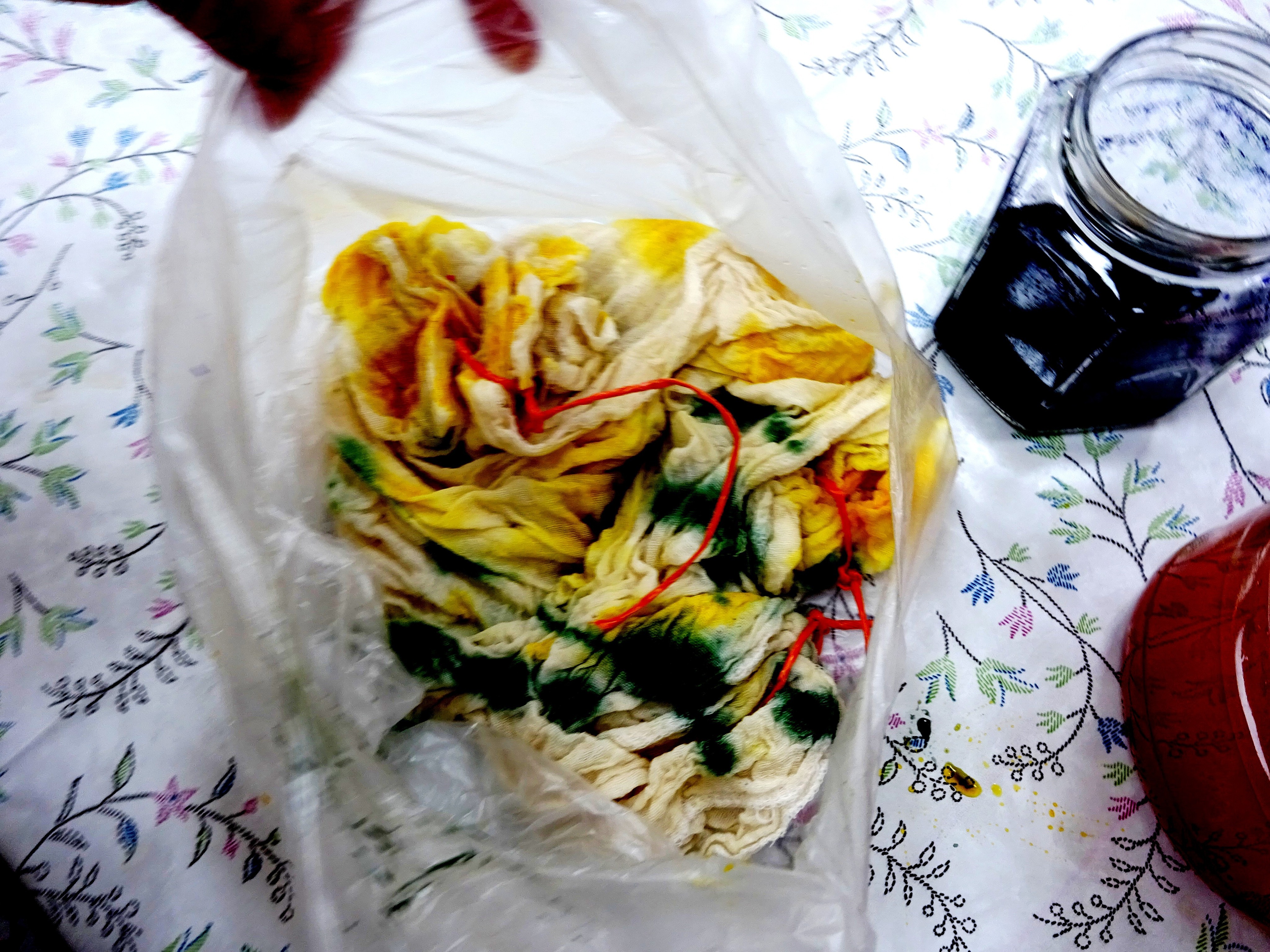 A jak jsme na to šli? Látku jsme vyvázali podobně jako u klasické batiky provázkem, tak se vytvoří různá kolečka či proužky. Barvy jsme rozmíchali v kelímku tak, aby nebyly příliš naředěné. Na mokrou látku jsme pak nanášeli barvičky pomocí injekčních stříkaček. Hotové dílo jsme přendali do předem propícháného igelitového sáčku.