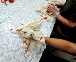 A jak dál? Mikrovlnku nastavíme na plný výkon a vlníme asi sedm minut. Po obarvení sáček opatrně vyjmeme a necháme částečně vychladnout. Nakonec obarvený textil vymáchejte ve studené vodě, do které přidáme asi 2 dl octa. Odstraníme provázky, znovu vymácháme v octové vodě, usušíme a vyžehlíme.