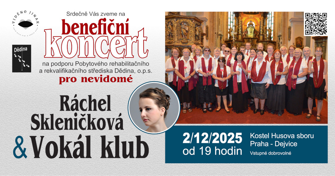 Chtěli bychom Vás srdečně poznat na benefiční koncert na podporu Pobytového rehabilitačního a rekvalifikačního střediska Dědina, o.p.s pro nevidomé. Vystoupí Ráchel Skleničková a Vokál klub. Vystoupení bude v kostele Husova sboru v kostele Husova sboru, Wuchterlova 523/5, Praha - Dejvice dne 2. 12. 2025 od 19 hodin.