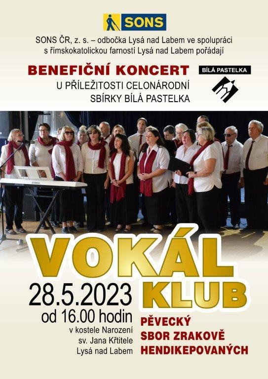 Vokál klub vás zve na benefiční koncert do kostela Narození sv. Jana Křtitele v Lysé nad Labem. Koncert se koná 28. 5. 2023 od 16 hodin. Jde o benefiční koncert u příležitosti celonárodní sbírky Bílá pastelka. Koncert pořádá SONS ČR, z.s. - odbočka Lysá nad Labem ve spolupráci s římskokatolickou farností Lysá nad Labem.