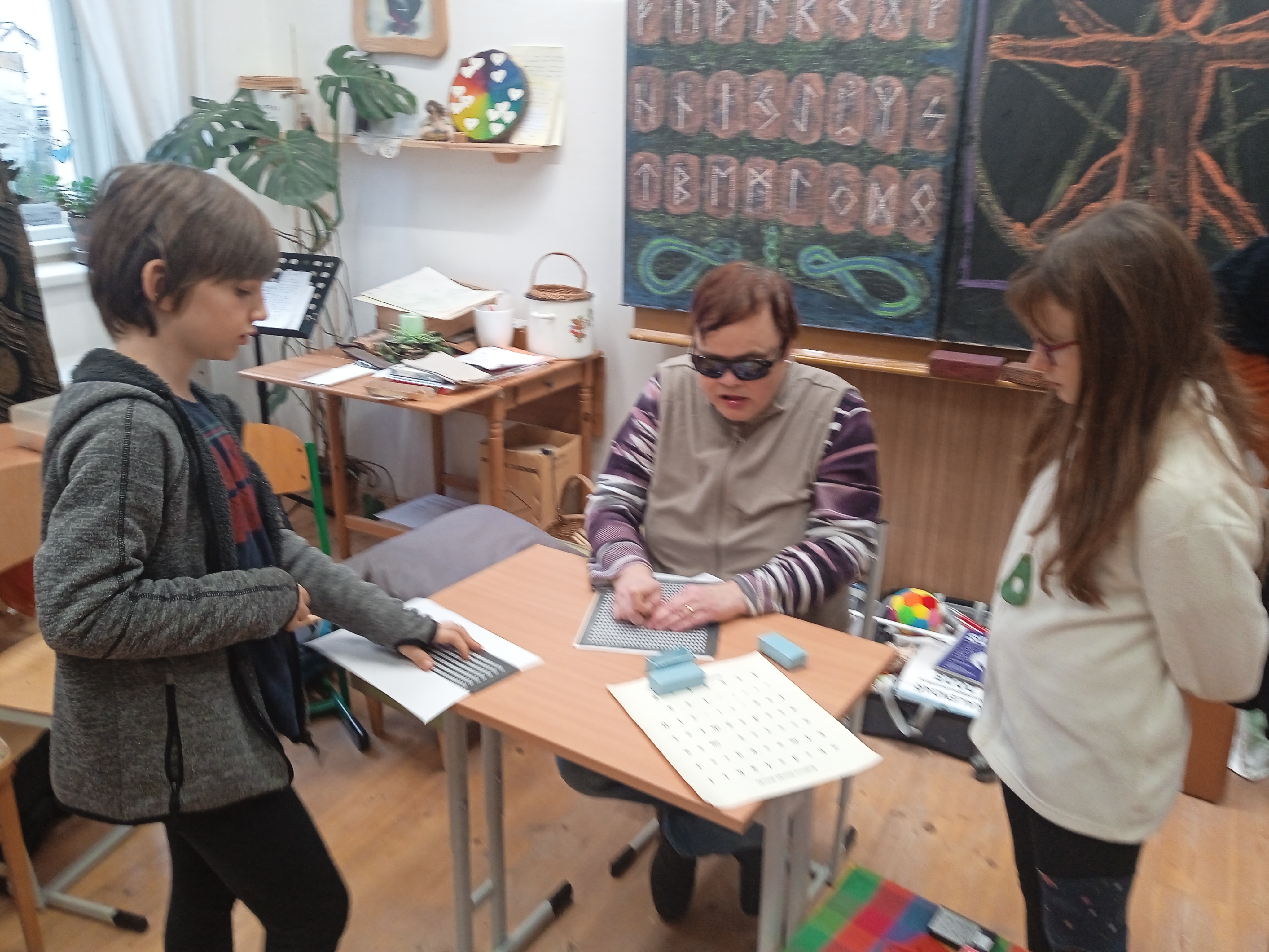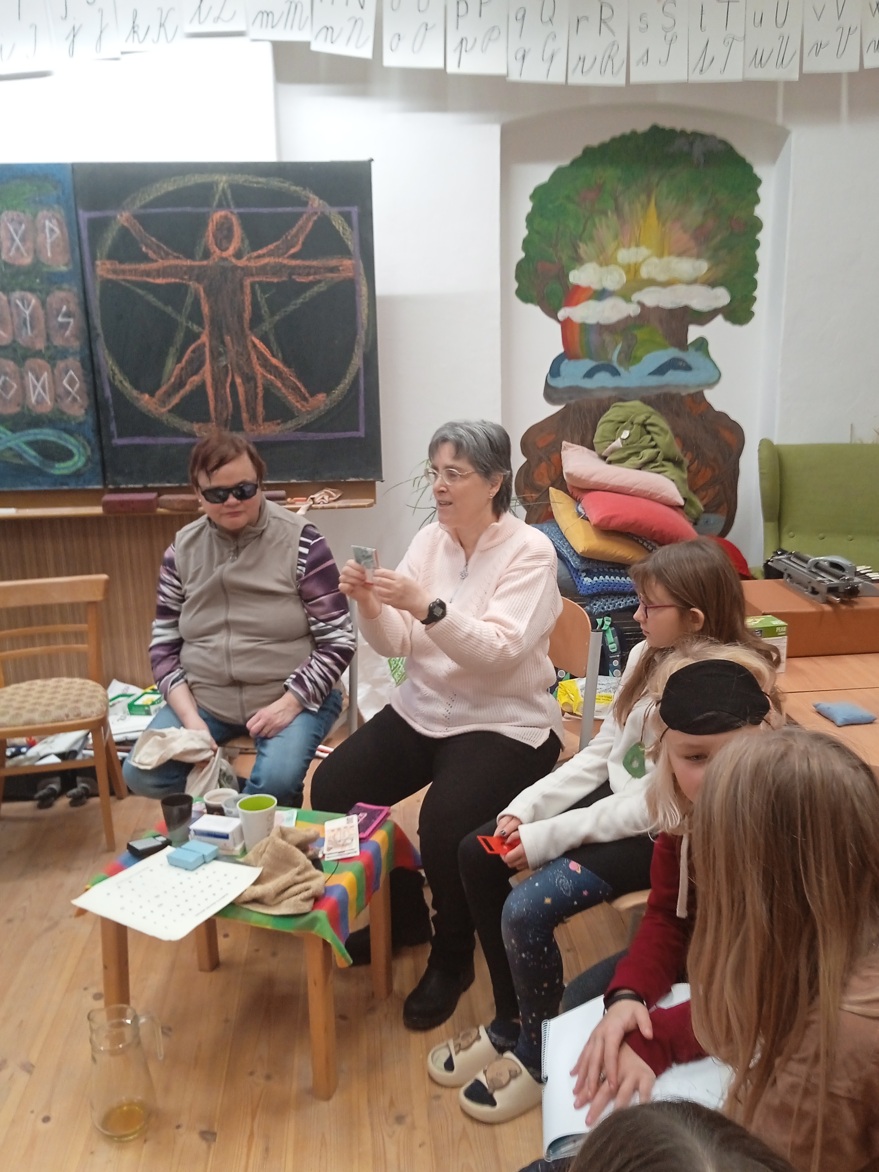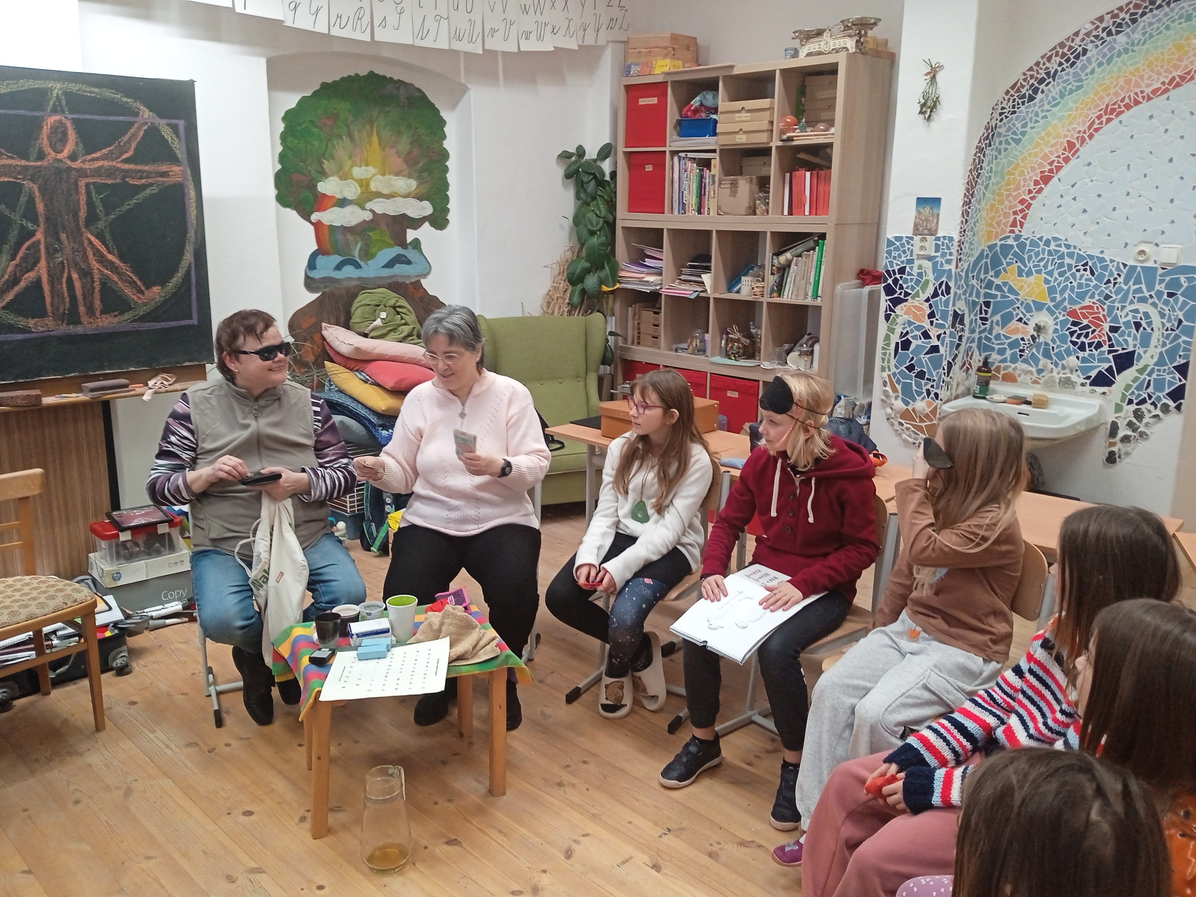 I letos jsme se opět vypravily na naší první besedu, a to do školy, kde už nás znají a kde jsme již po čtvrté seznámily děti s problematikou zrakového postižení. Naše kroky vedly do Waldorfské základní školy Mistra Jana v Ratibořských Horách. Beseda se uskutečnila pro děti čtvrté třídy a jelikož je tato třída, co do počtu dětí menší, bylo to velice mile strávené dopoledne. Hned při výstupu z auta se k nám již hlásila paní učitelka, ze třídy, kterou jsme navštívily v minulém roce a doprovodila nás do školy. Ve škole nás čekalo další milé překvapení. Hlásila se k nám milá paní. A dámy hned podle hlasu poznaly Kristýnu Štrasovou, která nám v naší odbočce před patnácti lety vedla kurz keramiky. Bylo to milé setkání. Pak jsme se již zaposlouchaly do písní, které děti na Waldorfských školách zpívají místo zvonění a společně tak krásně zahajují den. Následně se kolem nás rozpoutal ruch, kdy děti odcházely do jednotlivých tříd. My jsme se odebraly do čtvrté třídy, která se nacházela hned vlevo v přízemí. Jak už jsme věděly z předchozích let, děti ve čtvrté třídě mají téma smysly a vše co s tím souvisí. My jsme si pro ně připravily besedu o důležitosti zraku a o tom, co se děje, když ho nemáme či máme velice oslabený. Zážitek z interaktivní besedy byl pro děti velice zajímavý. Děti byly zvídavé. Jak to vlastně je, když o zrak člověk přijde. Děti si na úvod besedy připravily pro nás zpívání a také nám společně zahrály písně na flétny, zarecitovaly několik básní a pak plné očekávání na nás upřeně hleděly. My jsme dětem představily a pověděly příběh Luise Brailla, pak jsem předala slovo našim dvěma členkám Emě Kumherové a Laďce Svobodové, které jim pověděly svůj příběh se zrakem. Po příbězích dostaly děti kvíz, zda uhádnou, k čemu slouží kartička na podpis a jak se rozeznávají jednotlivé bankovky. Když si to děti vyzkoušely, tak se přesunuly ke stolečku, kde již byla nachystaná Ema a Pichtův psací stroj, Laďka a bodátko s tabulkou a mohlo začít psaní. Děti se velice zajímaly o všechno a samozřejmě si napsaly i své jméno. Já jsem se přesunula ke stolečku, kde byl připraven džbán s vodou a hladinka. Děti si s klapkami na očích zkoušely nalévat vodu, Laďka jim popovídala o dalších pomůckách, které jsou pro ni důležité a které jí usnadňují život. Děti si také zahrály hry pro nevidomé. Zaujalo je Člověče nezlob se a tak si ho s klapkami zkusily zahrát. Děti měly spoustu dotazů a Ema i Laďka jim trpělivě vysvětlovaly a odpovídaly. Děti byly také odvážné, a zkoušely i chození s bílou holí a to i po schodišti a s klapkami na očích. Nakonec jsme jim zapůjčily hru Quardo a popřály hodně štěstí při dalším studiu. Beseda se velice povedla a byla přínosem, jak pro děti, tak i pro samotné nevidomé ženy, které jak samy říkaly, strávily s dětmi krásné smysluplné dopoledne, a ještě k tomu s pěkným kulturním zážitkem. Laďka i já jsme si také mohly pochovat dvě dámy Lucinku a Mrkvičku. To jsou dvě krásně zbarvené morčetí dámy, o které se žáci tamější třídy starají.
