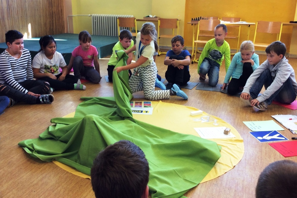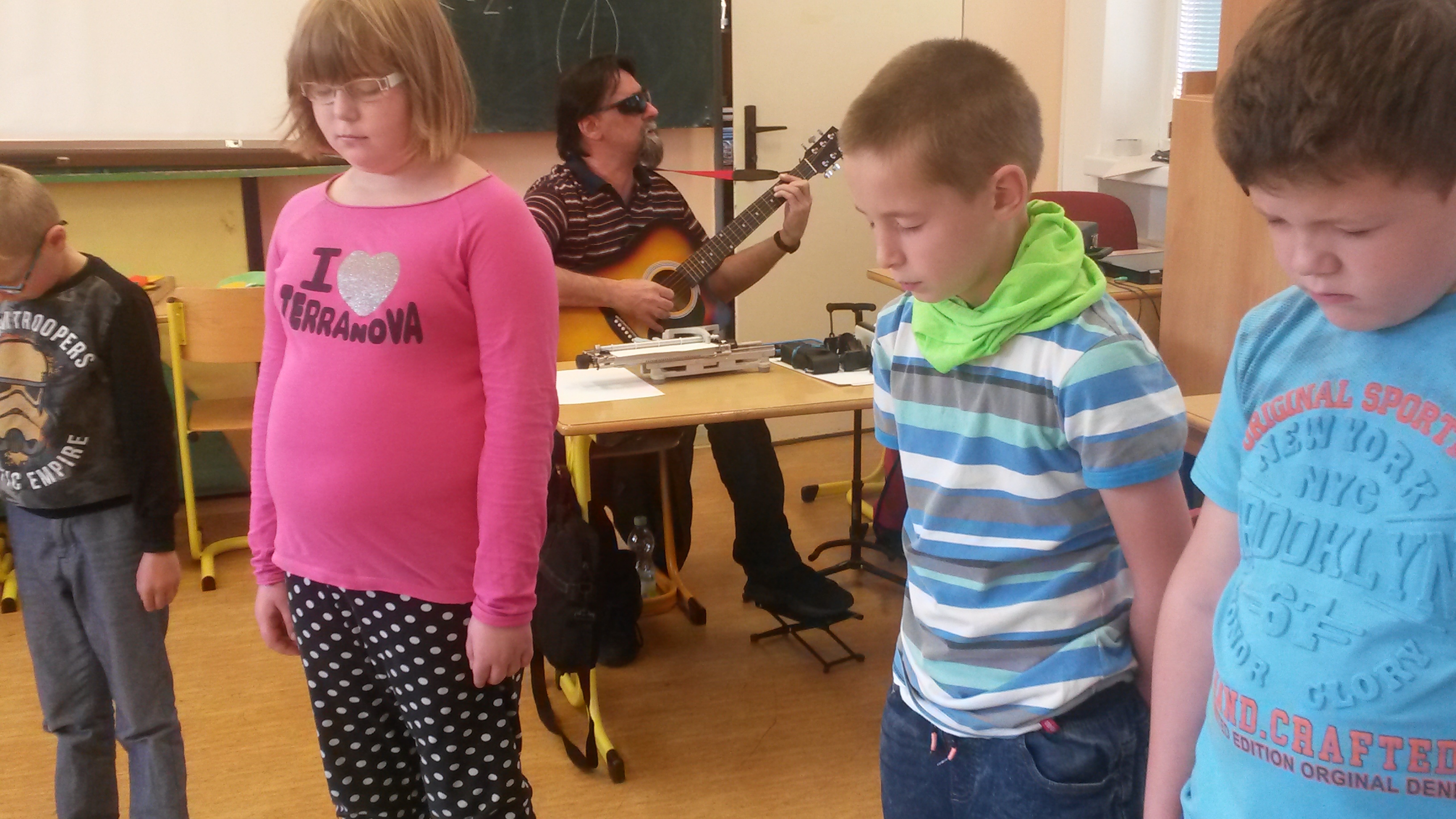 Beseda začala příchodem dětí do učebny se zavázanýma očima. Ve třídě ještě poslepu vytvořily za naší dopomoci kruh a doposlouchaly probíhající hudební vystoupení našeho velkého pomocníka, nevidomého kytaristy, pana Radomila Zapletala. Poté mohly děti znovu otevřít oči a rozkoukat se, do jakého světa jsme je pozvali. Uprostřed kruhu je čekalo překvapení, které jsme s jejich pomocí postupně odhalovali.