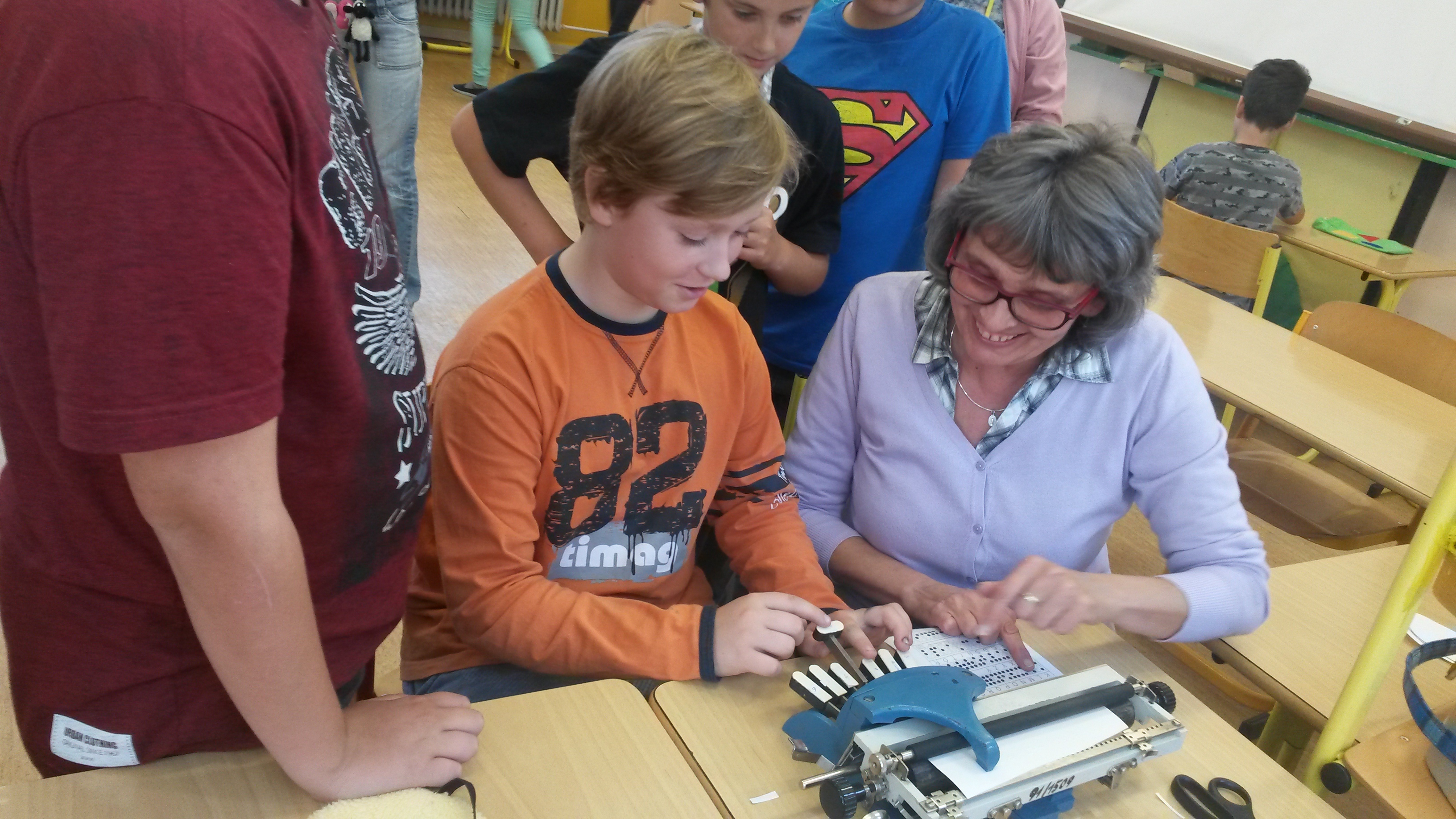 V druhé části besedy byl prostor klást zvídavé dotazy nevidomému. Některé otázky byly „na tělo“, jiné úsměvné, ze života. Pan Zapletal s sebou přinesl pomůcky, které jsou nezbytné v jeho životě a předvedl je dětem – Pichtův psací stroj, značkovač Dymo, mluvící hodinky a telefon, tiskoviny v Braillově písmu (kalendář, diář, časopis), rozlišovač barev, apod.