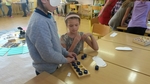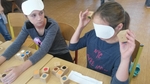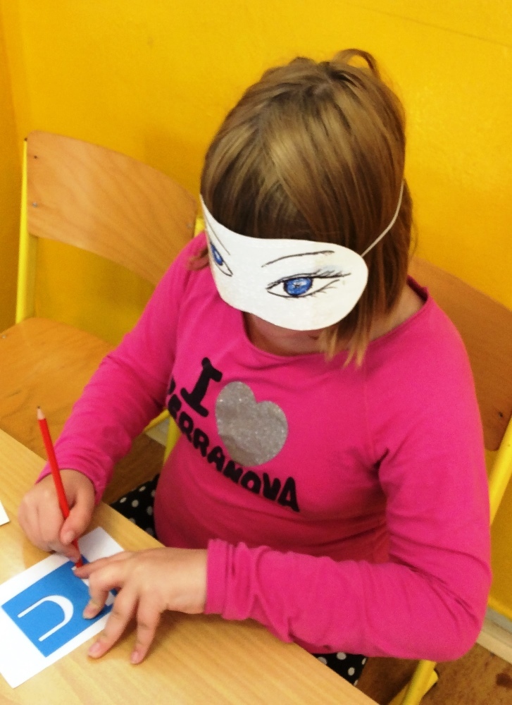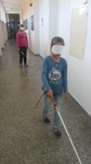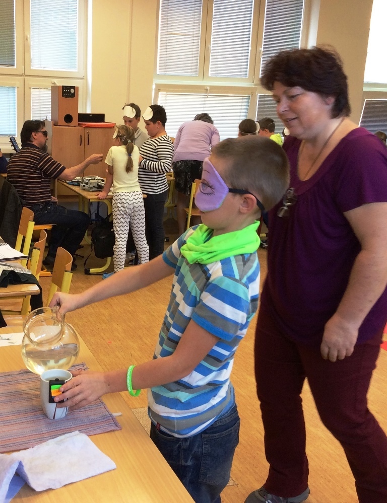 V poslední části jsme si s dětmi prošli všechna připravená stanoviště, aby věděly, co je na každém z nich čeká. Děti se rozdělily do dvojic a podle jejich výběru si prošly stanoviště, která je nejvíc zajímala. Největší zájem byl o nácvik chůze s bílou holí, psaní na Pichtově psacím stroji a nalévání vody do hrnečku s indikátorem hladiny.