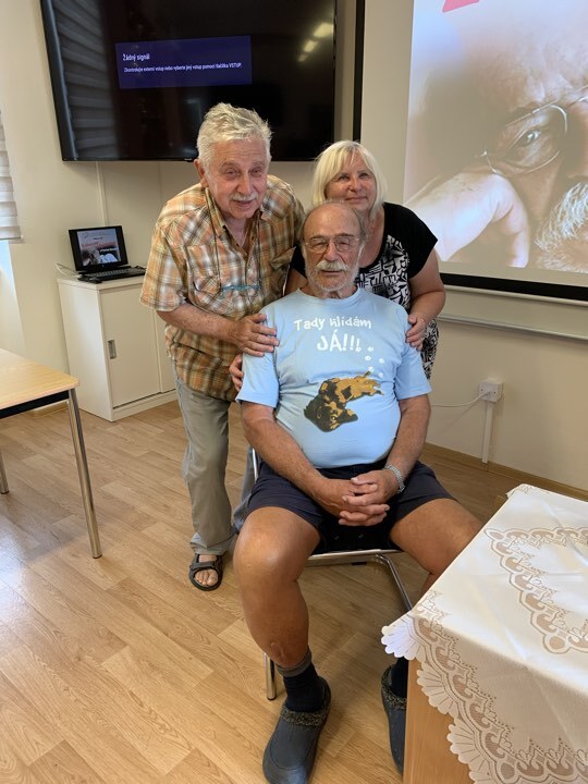 Ten s námi zavzpomínal na své dětství, podělil se o spoustu veselých historek nejen ze zákulisí natáčení legendární komedie S tebou mě baví svět, nevynechal však ani své zážitky z období, kdy v důsledku západonilské horečky prošel klinickou smrtí a následně jej po ochrnutí čekala dlouhá cesta k postupnému zotavení. Trpělivě odpovídal na veškeré naše dotazy a díky své vstřícnosti a vtipným reakcím vytvořil skvělou atmosféru tohoto nezapomenutelného odpoledne. Děkujeme ještě jednou za společný zážitek kolegům a uživatelům poradenského centra i všem našim členům, kteří se k nám ve středu připojili.