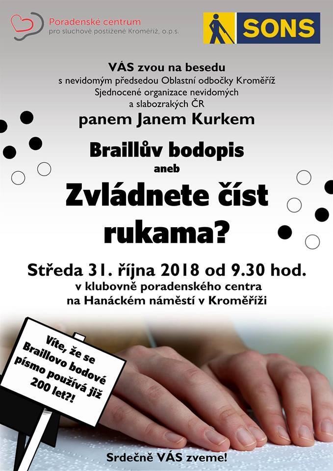 Ve spolurpáci s Poradenské centrum pro sluchově postižené Kroměříž si Vás dovolujeme co nejsrdečněji pozvat na besedu nejen o Braillově bodopisu, kterou si na 31. 10. 2018 připravil předseda naší odbočky, pan Jan Kurek. Akce se uskuteční v klubovně Poradenského centra (v našem patře na začátku chodby) v 9:30 hod. Těšíme se na společné setkání!