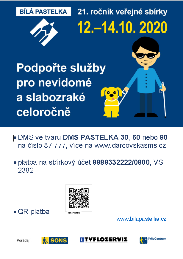 Pomozte nám udržet se nad vodou v této zlé situaci, abychom až to vše pomine, mohli i nadále zrakově postiženým z našeho kraje poskytovat služby, které jsou jedinečné a nikde jinde než v SONS ČR, Tyfloservisech a Tyflocentrech nenajdou. Právě tyto tři subjekty jsou pořadateli sbírky.