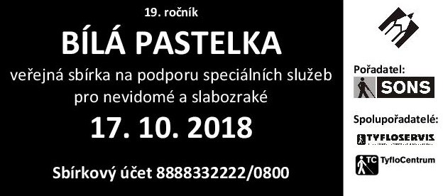 Ve středu 17. října 2018 proběhne u příležitosti Mezinárodního dne bílé hole již 19. ročník celonárodní veřejné sbírky Bílá pastelka. Její výtěžek podpoří speciální služby pro nevidomé a těžce zrakově postižené poskytované v celé ČR. Pořadatelem sbírky je Sjednocená organizace nevidomých a slabozrakých ČR, zapsaný spolek (SONS ČR, z.s.) ve spolupráci se svými dceřinými obecně prospěšnými společnostmi Tyfloservis a krajskými TyfloCentry.