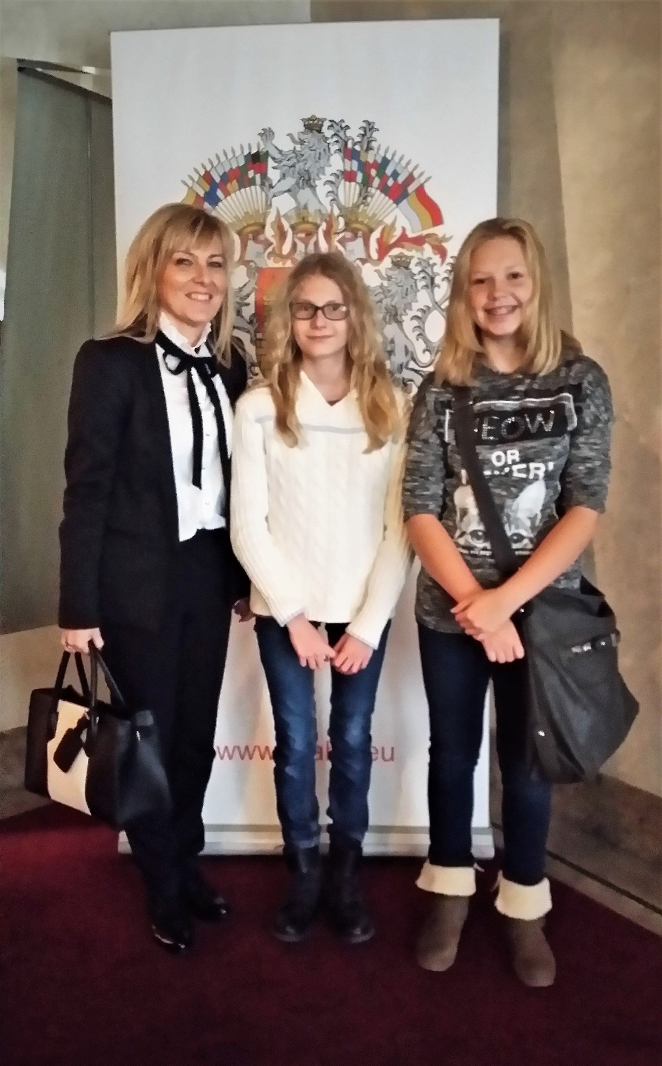 Dvojice děvčat ze ZŠ Trávníky - Karolína Andrýsková a Sabina Hoferková se spolu s paní učitelkou PaeDr. Hanou Vyoralovou zúčastnila slavnostního poděkování nejlepším dvojicím v rámci sbírky Bílá pastelka.