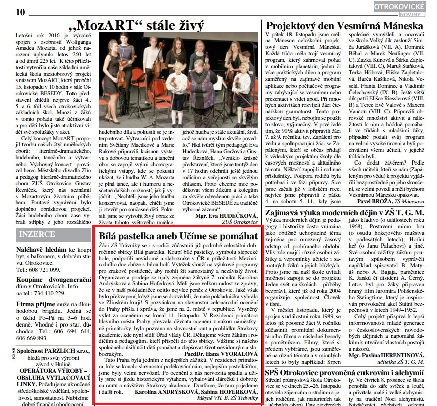 Děvčatům se za pomoci paní učitelky podařilo mezi spolužáky, jejich rodičmi i dalšími učiteli prodat tolik pastelek, že nejenže skončila na prvním místě z celého Zlínského kraje, ale také jako celkově druhá nejlepší dvojice z celé republiky!