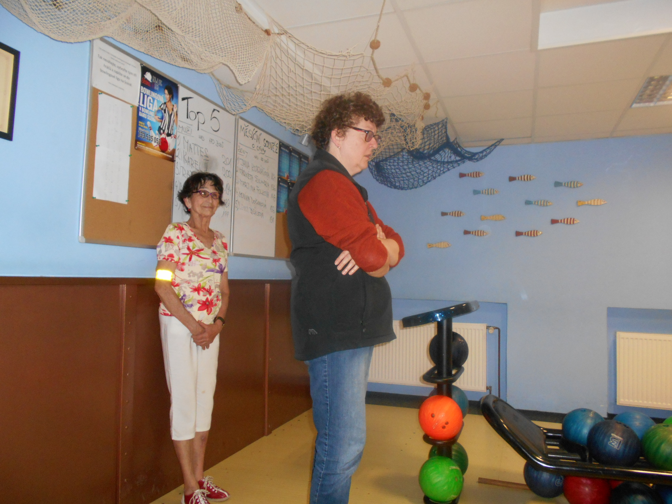 Poprvé jsme měli možnost vyzkoušet si hru s postranními zábranami, díky kterým byly naše hody úspěšnější a bodové zisky všech hráčů pěkně narůstaly. I když naše hra připomínala chvílemi spíše kulečník, byli jsme s výsledky spokojeni. Vždyť trefit se koulí do zábrany na správném místě a pod správným úhlem, aby bylo po jejím odrazu dosaženo kýženého výsledku, je pro nevidícího skvělý výkon. Naše výsledky přiměly vyzkoušet si pár hodů i ty, kteří obyčejně nehrají, a tak dubnový bowlingový turnaj skončil s těmito výsledky: v prvním kole – Alena Řezníčková 71 bodů, Pavla Poláková 83 bodů, Jan Kurek 76 bodů, Jana Varaďová 102 bodů, Jakub Varaďa 123 bodů; ve druhém kole – Erika Hanzalová 41 bodů, Ludmila Fridrichová 31 bodů, Jan Kurek 32 bodů, Jana Varaďová 31 bodů, Jakub Varaďa 42 bodů.