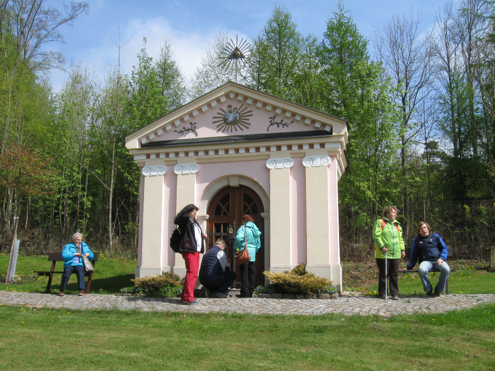 3. května jsme se vydali zavzpomínat na naší bývalou členku paní Mikešovou ke kapličce v areálu Buřtárny U pěti buků nad Trutnovem. Zde jsme ji rozsvítili svíčku a uctili její památku. Jelikož se areál nachází v krásné přírodě, tak jsme se prošli nejen cestou na místo a zpět, ale i po okolí. Počasí nám opět přálo. Příjemně unavení jsme nakonec zasedli i k prostřenému stolu místní restaurace. S plnými břichy nám to šlo dolů do Trutnova opravdu lehce, stačilo se skulit z kopce...
