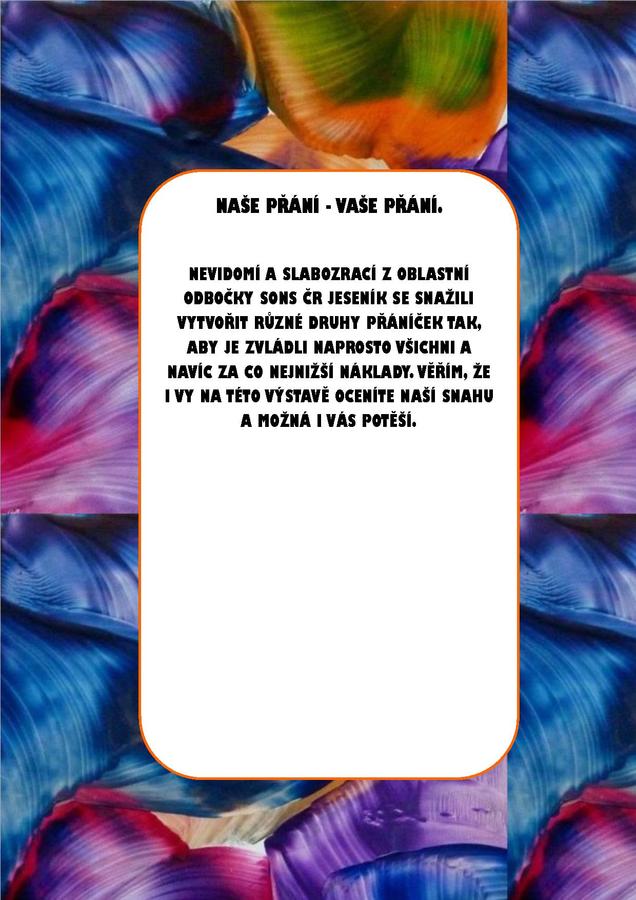 V rámci této akce bude oblastní odbočka Jeseník prezentovat Dny umění na Moravě. Pro veřejnost je připravena akce pod názvem Naše přání – Vaše přání, k zhlédnutí bude prezentace přáníček z klubu Šikula, simulační brýle, stolní hry pro NS a jiné aktivity SONS ve spolupráci s Metodickým centrem odstraňování bariér SONS Praha.