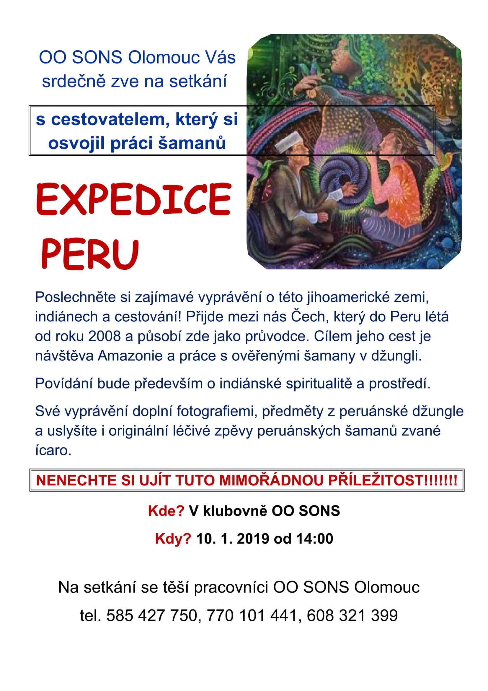 Uživatelé napjatě poslouchali a pokládali mu různé otázky související s jeho pobyty v této jihoamerické zemi a s životem indiánů. Náš host s sebou přinesl i různé místní peruánské předměty, které měli uživatelé možnost si zblízka prohlédnout i hapticky. Také pustil nahrávky originálních šamanských zpěvů zvaných ícaro a do dlaní nám nalil kapku peruánské "vůně". Přítomní tedy zapojili i svůj sluch, hmat a čich. Úžasný zážitek a neustálé dotazy stále prodlužovaly dobu akce. Všichni odcházeli velmi spokojeni. Moc děkujeme za výjimečné zážitky!