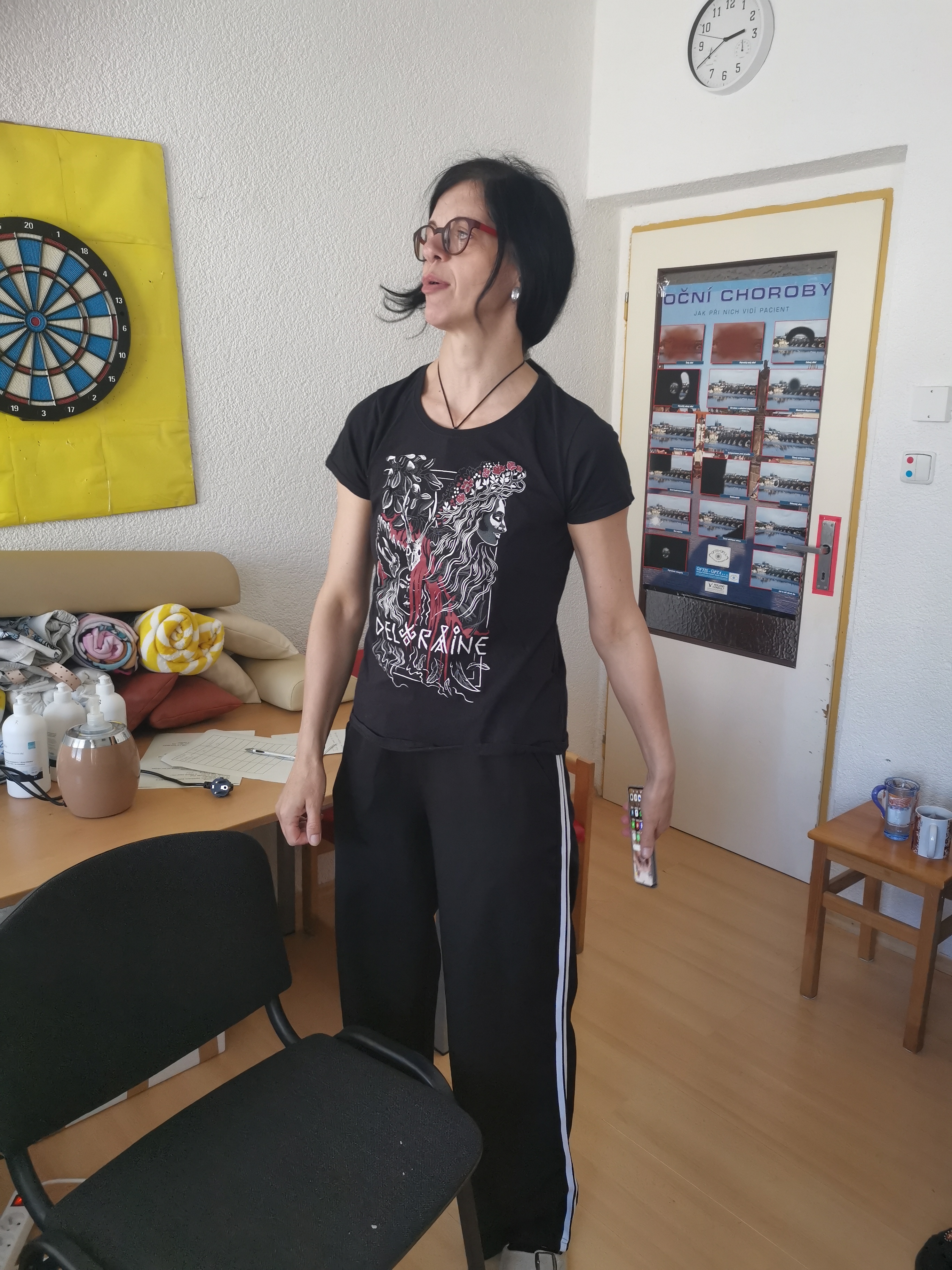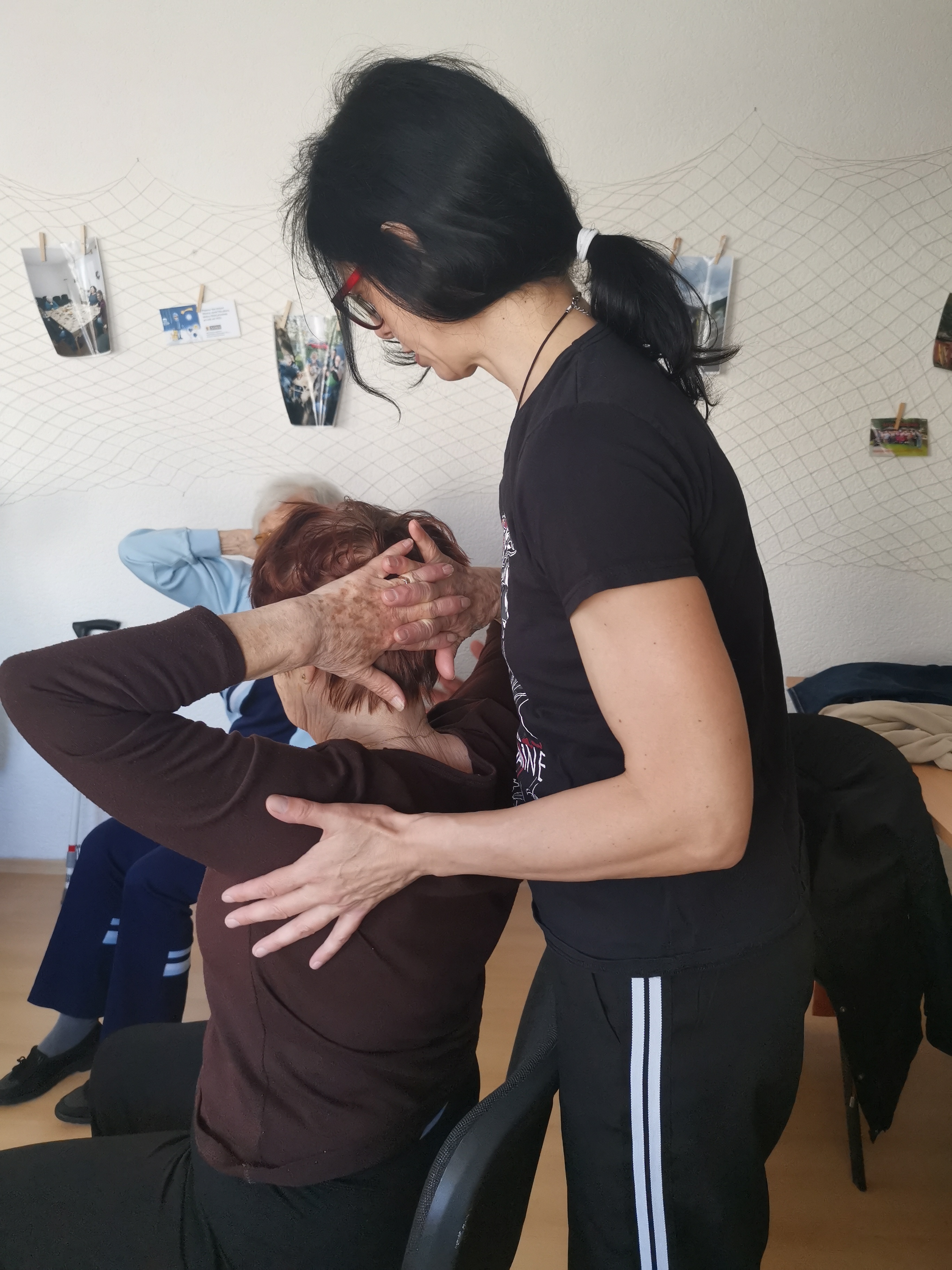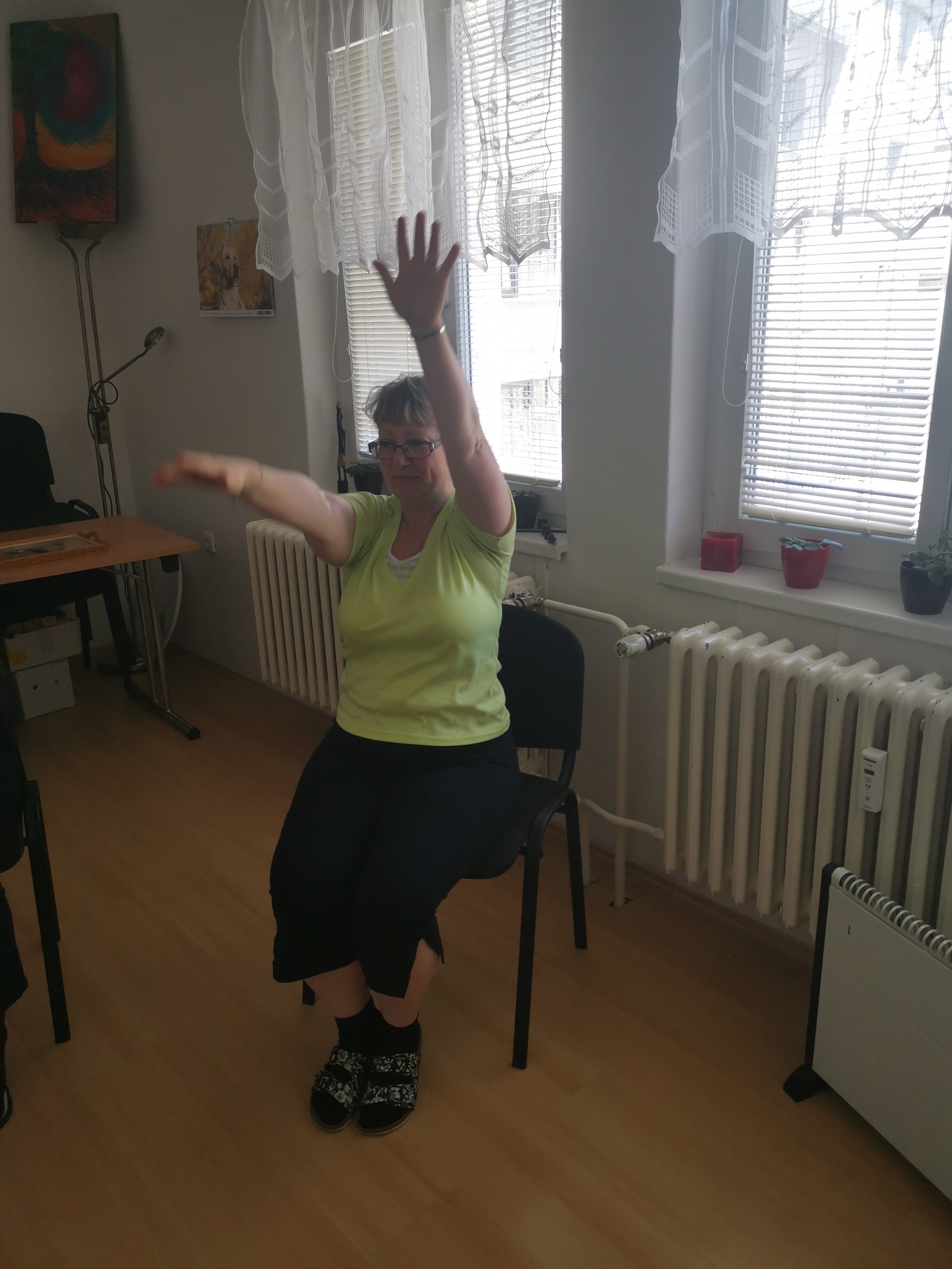 Dobře známe jejich (i svoje) limity, proto dnes, 22.04., začínáme se cvičením na židli. Ne se židlí, vážně na židli. Takže opravdu nejde o nějaké náročné hubnutí do plavek. Naopak, pohodové cviky – převážně protahování těla v sedě. Cvičíme a přitom sedíme.