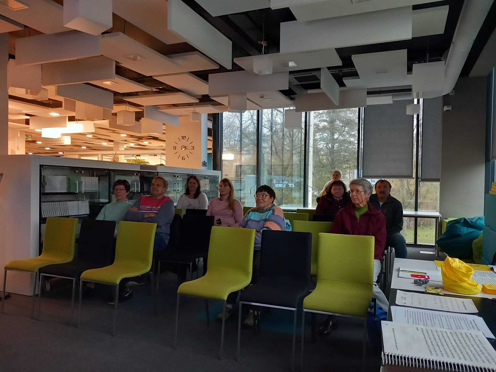 A jak to celé dopadlo? Za dětským oddělení knihovny je pěkná místnost, které se říká Rozhledna, je odtud přes prosklené stěny pěkně vidět na řeku Sázavu a člověk má opravdu pocit, že je v rozhledně. Ten den pršelo, foukalo, ruce si říkaly o rukavice a nohy o teplé boty, ale nám bylo hezky a na barevné stromy se pěkně koukalo. Možná i pro to psí počasí se nás sešlo „jen“ dvanáct a dva psí kamarádi Woody a Xasha. Přesto jsme si hezky popovídali a užili si příjemnou hodinku a půl.