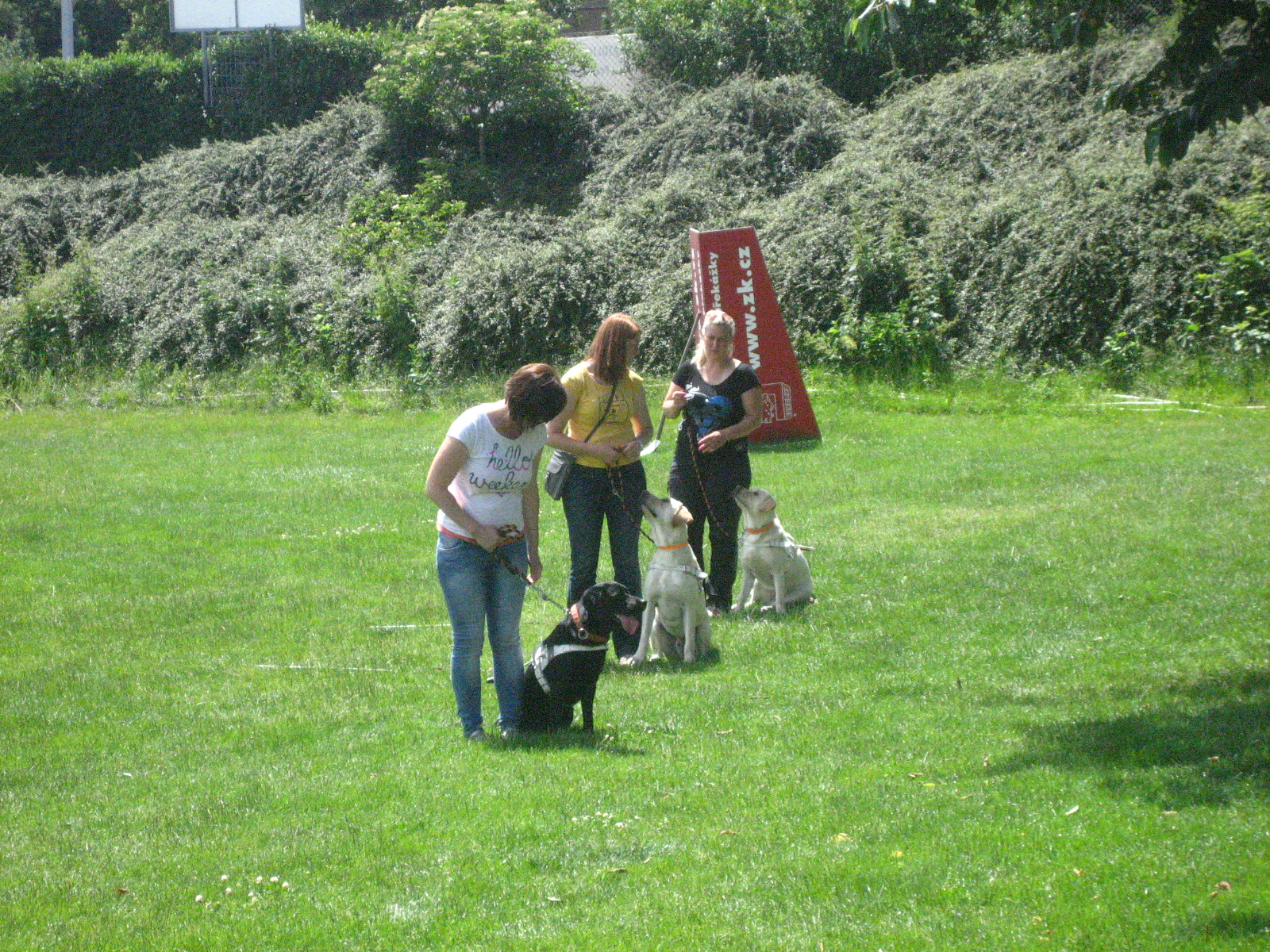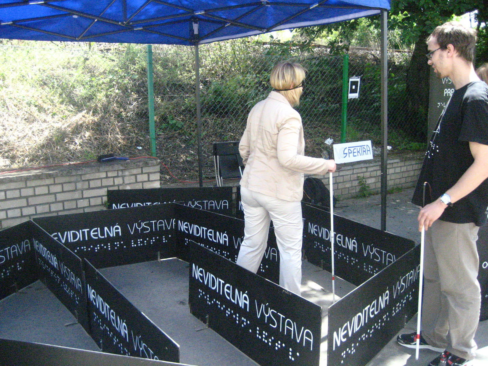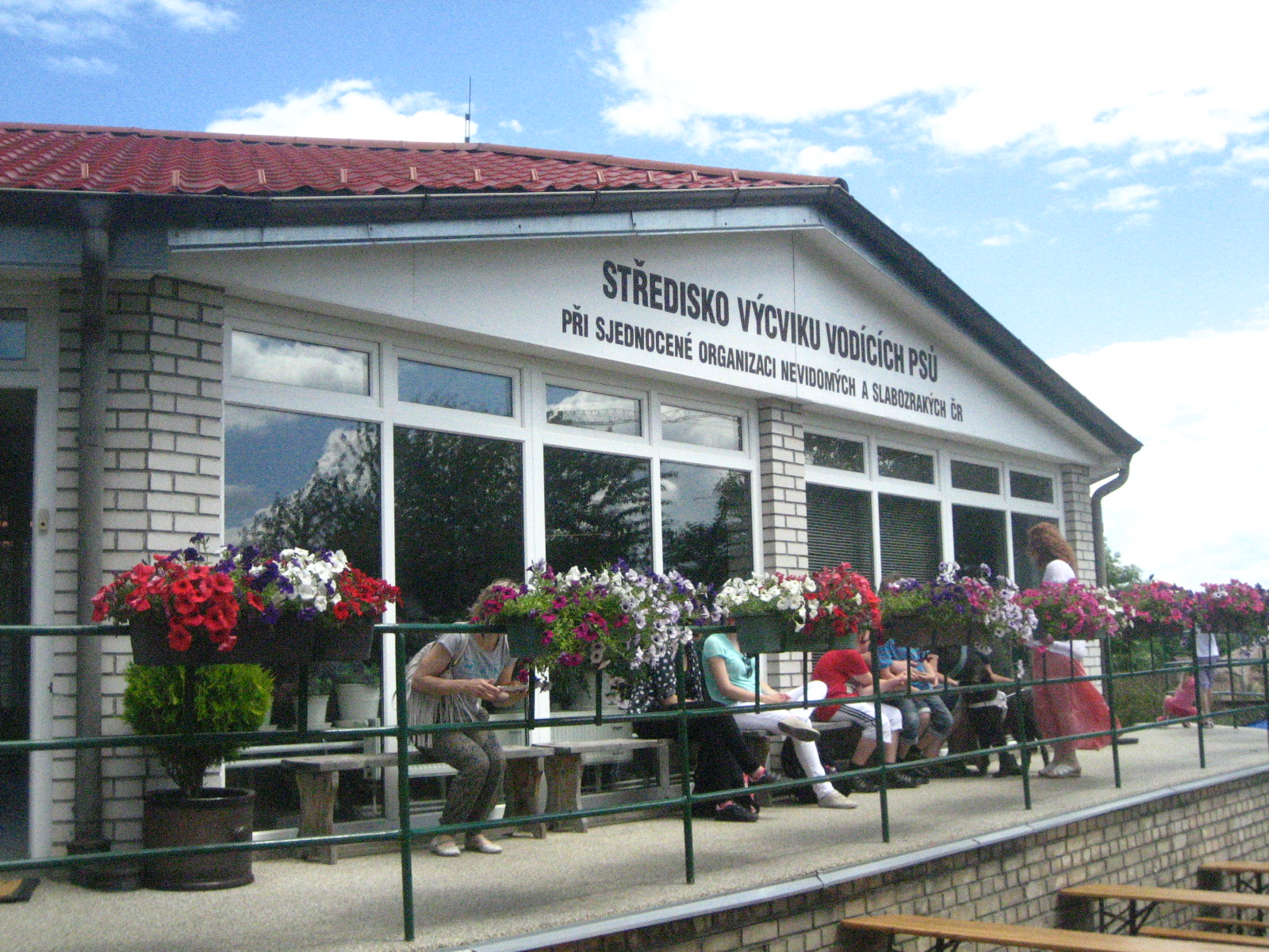 Po příchodu jsme se nahlásili u stolečku, s tím, že jsme až z Vrchlabí z odbočky a že bychom se rádi nechali provést areálem - tak, jak nám bylo po telefonu slíbeno. Bylo nám řečeno, že se čeká na více zájemců. Čekalo nás tam asi dvacet. Pak se skupina jaksi rozpustila, protože nikdo nepřišel. Takže jsme se vydali na obchůzku sami. Našli jsme kotce pro pejsky, kavárnu po tmě - kam jsme se ale bohužel nemohli z časových důvodů dostat - byla na objednání. Našli jsme "neviditelnou výstavu" - která tedy fungovala velmi dobře, až na to, že vše co nabízela, máme k dispozici na odbočce, takže bohužel nic nového. Pak jsme se shromáždili na ukázku výcviku vodicích psů - měli jsme tu čest vidět tři pejsky, kteří předvedli cca pětiminutový program - chůze u nohy, vyhnutí se překážce, zastavení, sedni, lehni, zůstaň a ke mně. Následně odešli.