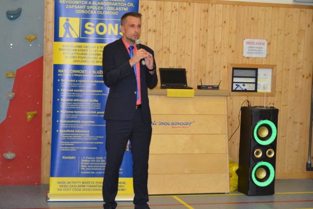Při slavnostním zahájení v krásné školní tělocvičně přivítal přítomné ředitel Školy prof. V. Vejdovského PaedDr. Mgr. Dan Blaha a předseda Oblastní odbočky SONS Olomouc Jan Příborský. Slova se ujal tajemník hejtmana Olomouckého kraje JUDr. Vladimír Lichnovský, vedoucí Odboru ochrany obyvatelstva olomouckého Magistrátu Ing. Jan Langr, zástupkyně Odboru sociálních věcí MMOl PhDr. Jana Haasová, vedoucí Centra pohybu Olomouc Mgr. Lenka Fasnerová a pracovnice Nadace profesora Vejdovského Mgr. Dagmar Sýkorová.