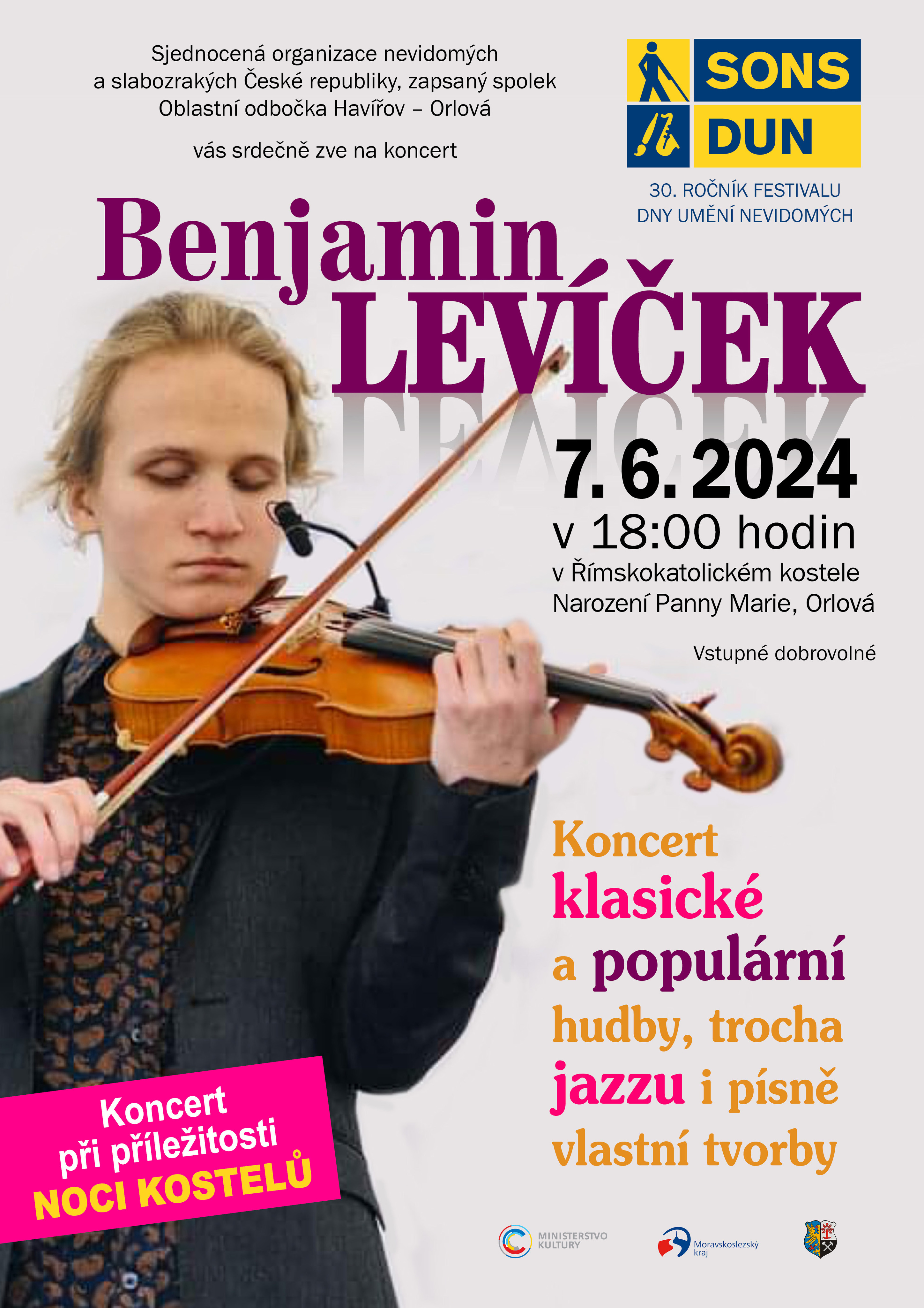 Zveme Vás na koncert Benjamina Levíčka, který se uskuteční 7. 6. v 18hod v Římskokatolickém kostele Narození Panny Marie při příležitosti "Noci kostelů" a 30. ročníku festivalu "Dny umění nevidomých" za podpory Ministerstva kulury, Města Orlová.