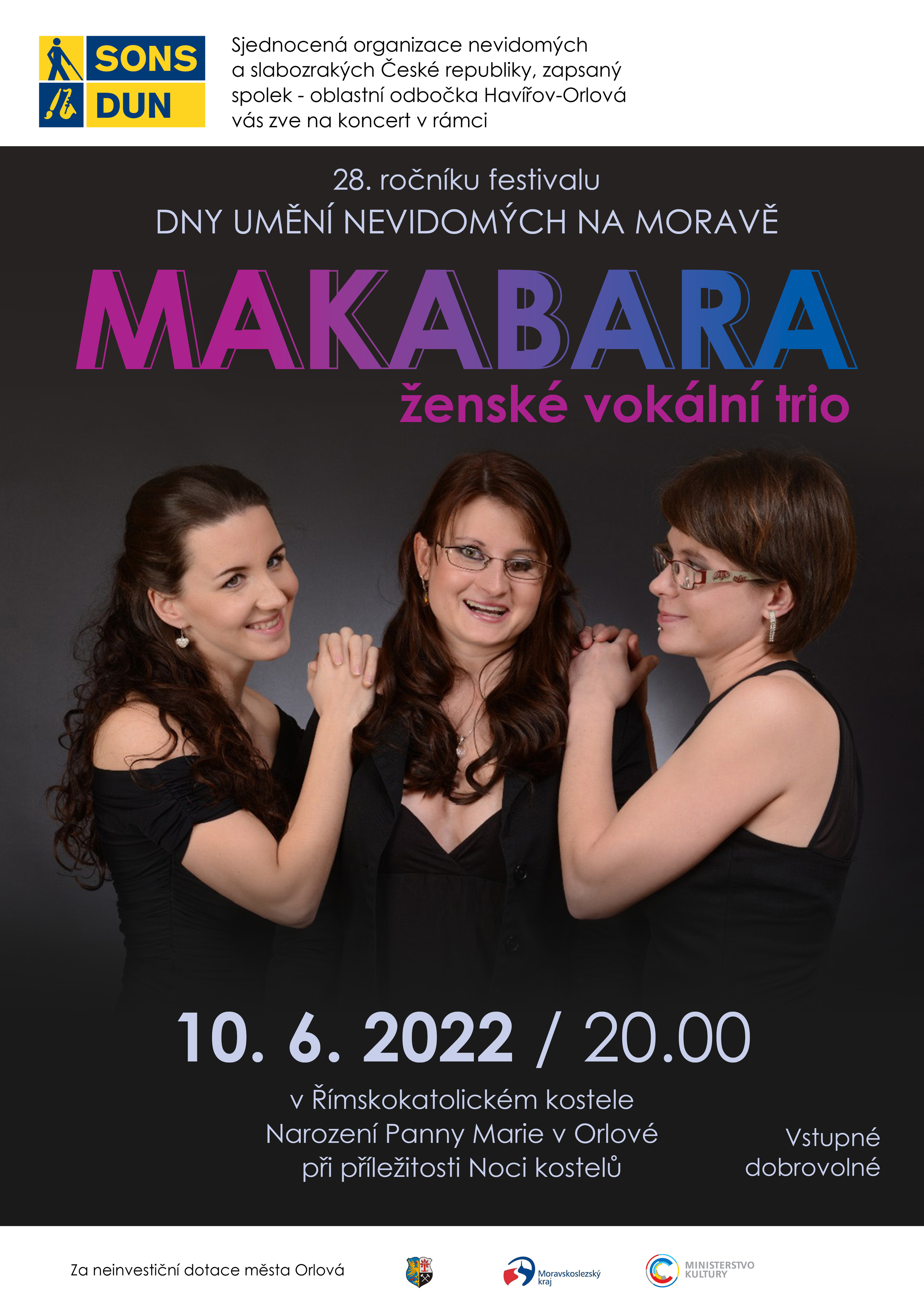 dovolte abychom Vás pozvali na koncert u příležitosti "Dny umění na Moravě" nevidomých a slabozrakých a u příležitosti Noci kostelů, který se bude konat 10. června v Římskokatolickém kostele Narození Panny Marie za neinvestiční dotace města Orlová a Moravskoslezkého kraje pod názvem MAKABARA trio, ve kterém se skrývá dívčí vokální trio, které tvoří Marie Vostatková (1. soprán), Kateřina Schejbalová (2. soprán) a Barbora Janová (alt), absolventky konzervatoře Jana Deyla v Praze. Název tohoto tria vznikl jako složenina prvních slabik křestních jmen jeho zpěvaček. Soubor, který vznikl v r. 2004 ještě na půdě konzervatoře,se v současné době zabývá interpretací hebrejských a židovských písní ve spolupráci s doc. Tomášem Novotným, sbormistrem ostravského souboru ADASH a pedagogem Ostravské university. V repertoáru MAKABARA tria nalezneme ale i české a moravské lidové písně , spirituály, skladby soudobých českých autorů (Zdeněk Šesták, Zdeněk Lukáš, Jiří Doubek, Jiří Pavlica) a v neposlední řadě i písně populární.