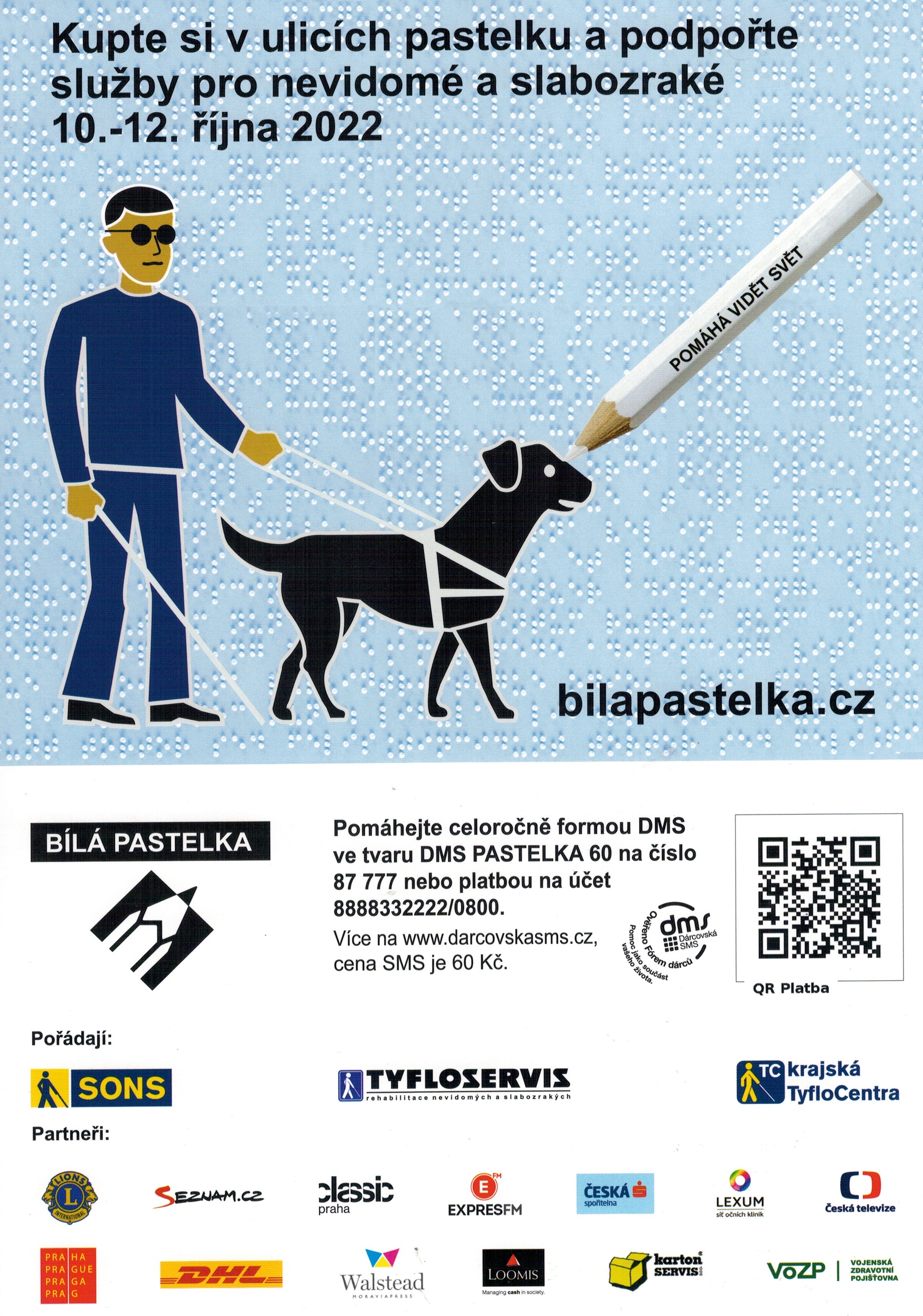 Letošní 23. ročník sbírky Bílá pastelka proběhne ve dnech 10. - 12. října po celé republice, u příležitosti Mezinárodního dne bílé hole, kterým je 15. říjen. Jako každý rok budou dobrovolníci v ulicích města nabízet bílé pastelky a kalendáře ve tvaru pastelky, s cílem finančně podpořit služby pro lidi se zrakovým postižením. Sbírkové kasičky jsou vybaveny QR kódem pro možnost bezkontaktní platby. Výtěžek sbírky je určen na dofinancování speciálních služeb pro nevidomé a slabozraké v rámci celé České republiky – např. na pomoc s návratem do běžného života lidem, kteří přišli o zrak v dospělosti, zaměstnávání lidí se zrakovým postižením, nácvik chůze s bílou holí, výcvik vodicích psů, výuku práce s počítačem se speciálním programem, apod. Více na www.bilapastelka.cz. Pořadatelem sbírky je Sjednocená organizace nevidomých a slabozrakých České republiky, zapsaný spolek. Děkujeme za vaši podporu!