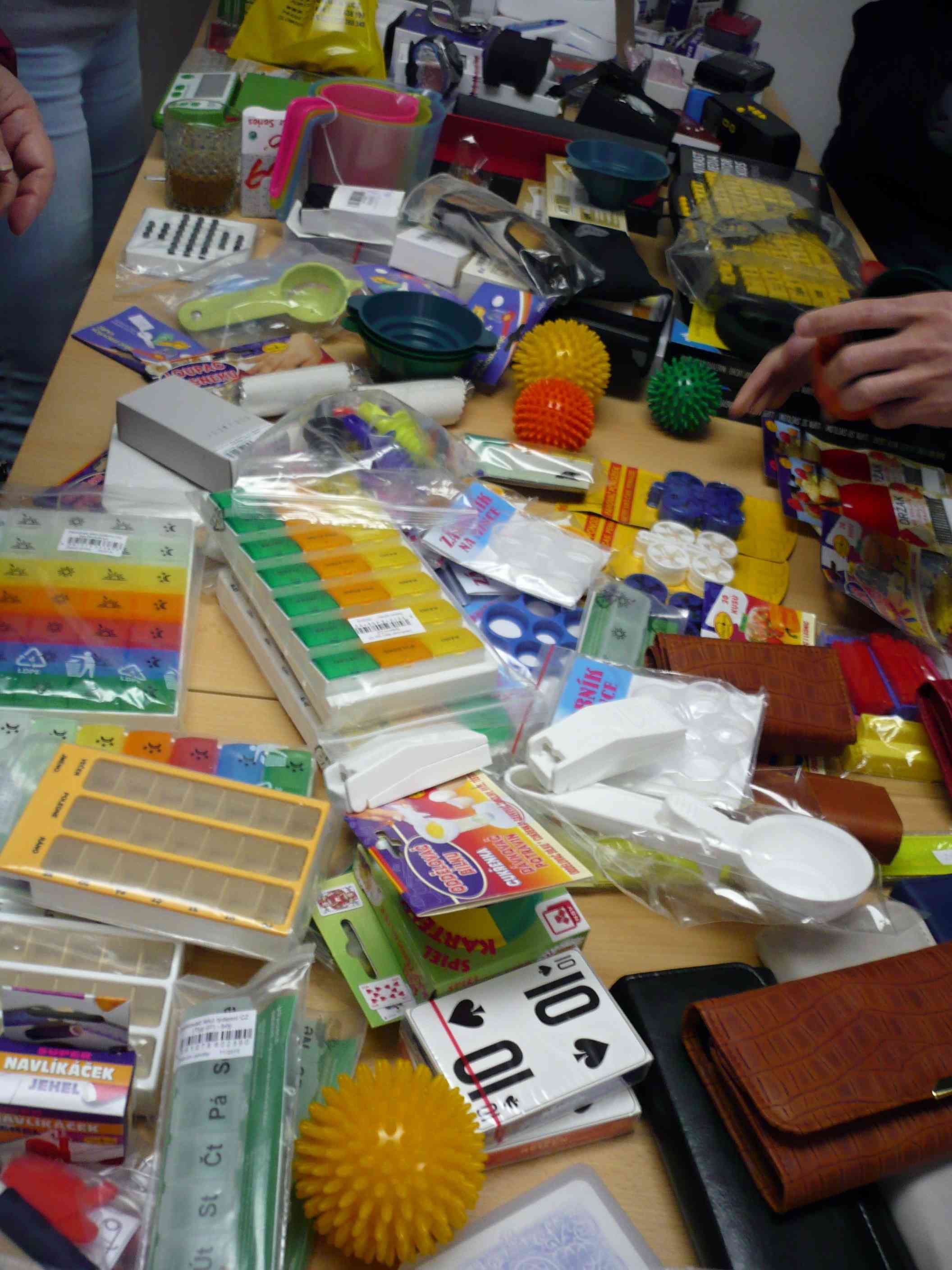 Tentokrát nás navštívil zástupce firmy SAGITTA l.t.d. s elektronickými kompenzačními pomůckami. Prodejní výstavu široké škály nejrůznějších pomůcek pro zrakově hendikepované zajistila vedoucí prodejny TYFLOPOMŮCEK Olomouc.