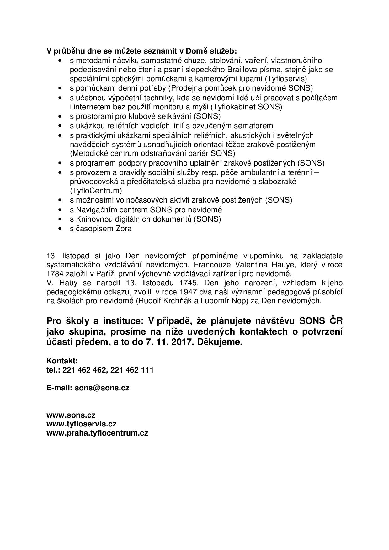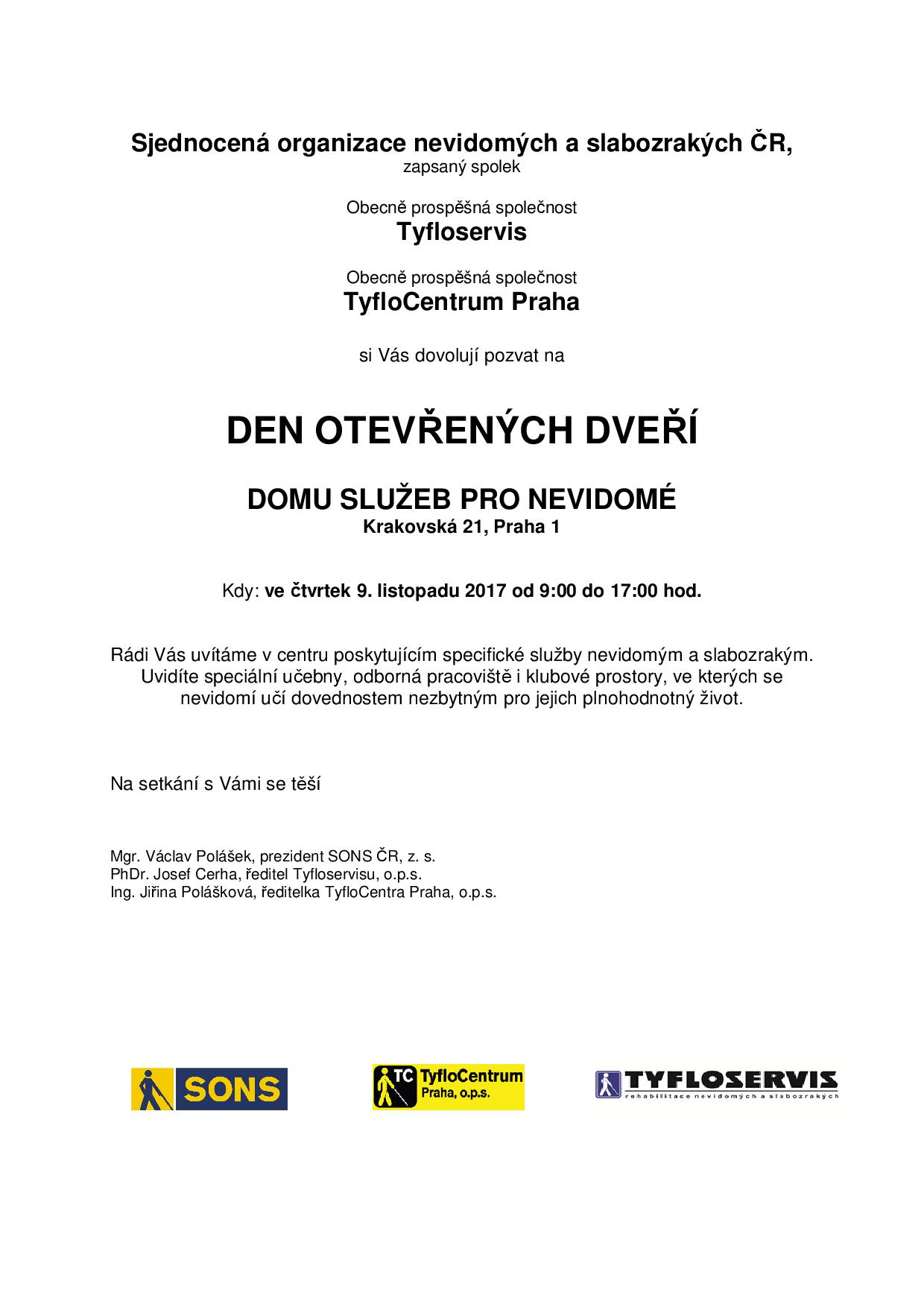 Přijďte se ve čtvrtek 9. listopadu 2017 mezi 9. a 17. hodinou podívat do našeho Domu služeb pro nevidomé v Praze, v Krakovské ulici 21. Uvidíte speciální učebny, odborná pracoviště i klubové prostory, ve kterých se nevidomí učí dovednostem nezbytným pro jejich plnohodnotný život.