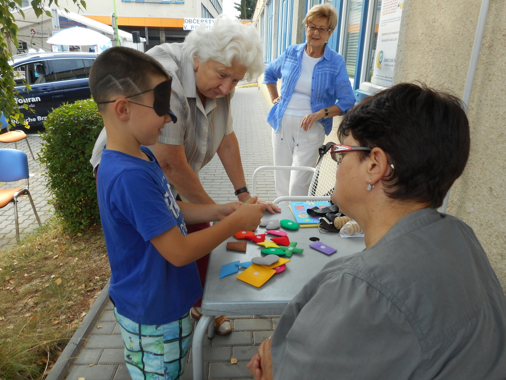 Dne 3. 9. 2016 proběhla v areálu blanenské nemocnice akce s názvem Den pro děti, které se zúčastnila i naše odbočka SONS v Blansku. Členové naší organizace měli pro děti připraveny rozmanité hry, které zjišťovaly schopnosti a dovednosti dětí a ukazovaly jim, jak složité a obtížné je orientovat se v životě bez pomoci zraku. Jednou z her, která děti nejvíce zaujala, bylo i poznávání geometrických tvarů a jejich přiřazování k sobě .Děti si vyzkoušely i zasunování dřevěných tvarů do správných rámečků, hmatem poznávaly tvary ovoce atd. Děti i dospělí měli možnost vyzkoušet si i chůzi s bílou holí. Největším lákadlem však pro děti i dospělé byli vodicí pejsci, byla to fenka Teila s paničkou Zdeňkou Stejskalovou. Součástí naší prezentace bylo nejen ukázat zájemcům, jak vodicí pejsci pracují a poslouchají, ale i jak složité je pro nevidomého člověka orientovat se v neznámém prostředí. Naším hlavním cílem totiž bylo seznámit širokou veřejnost s problémy nevidomých a slabozrakých.