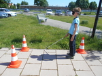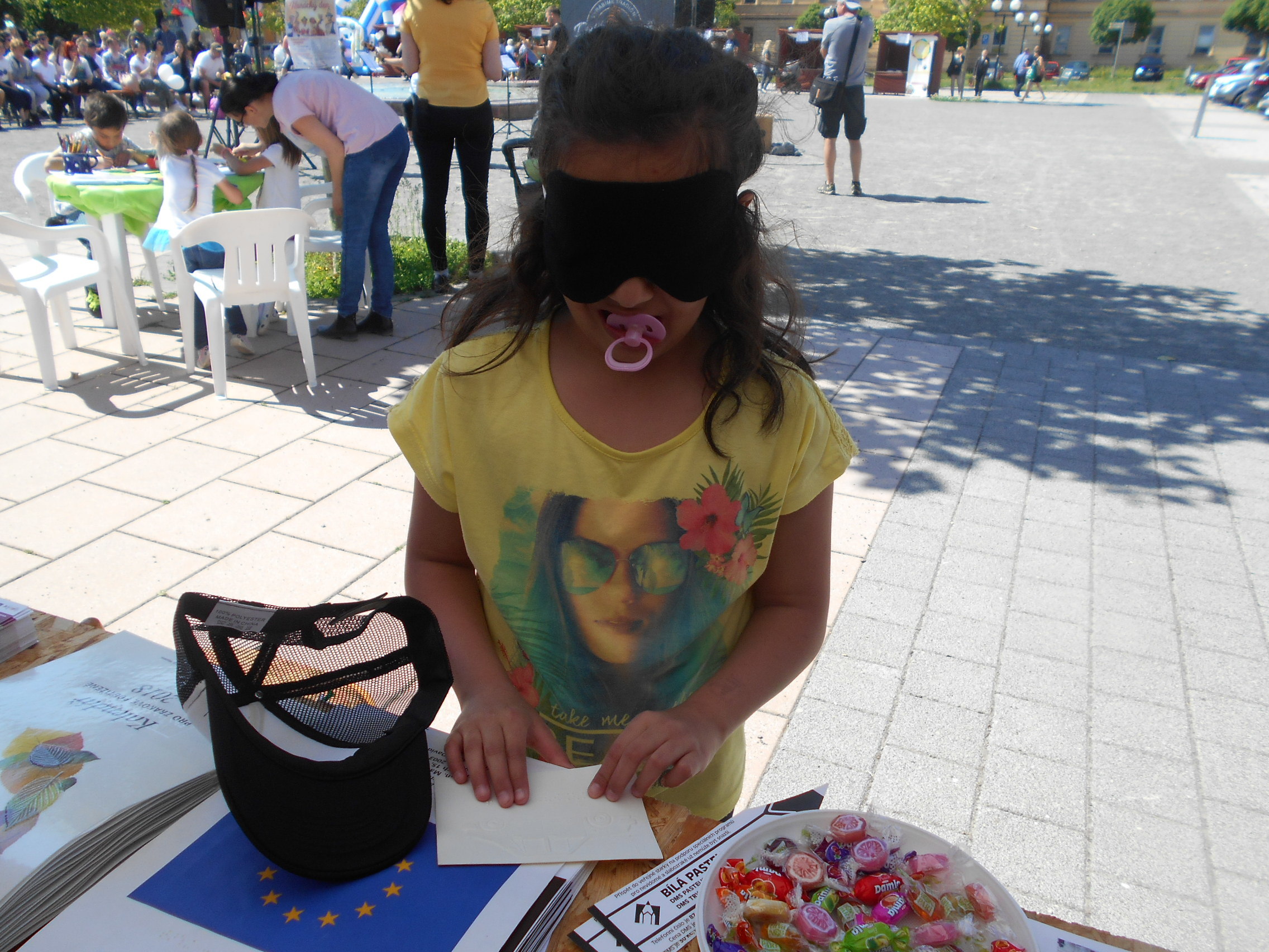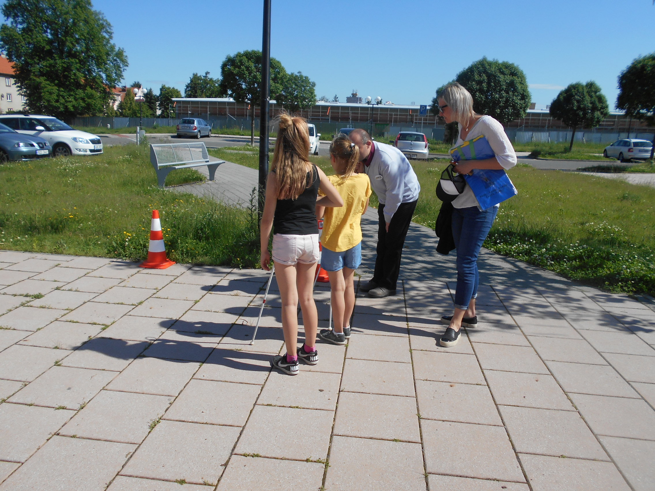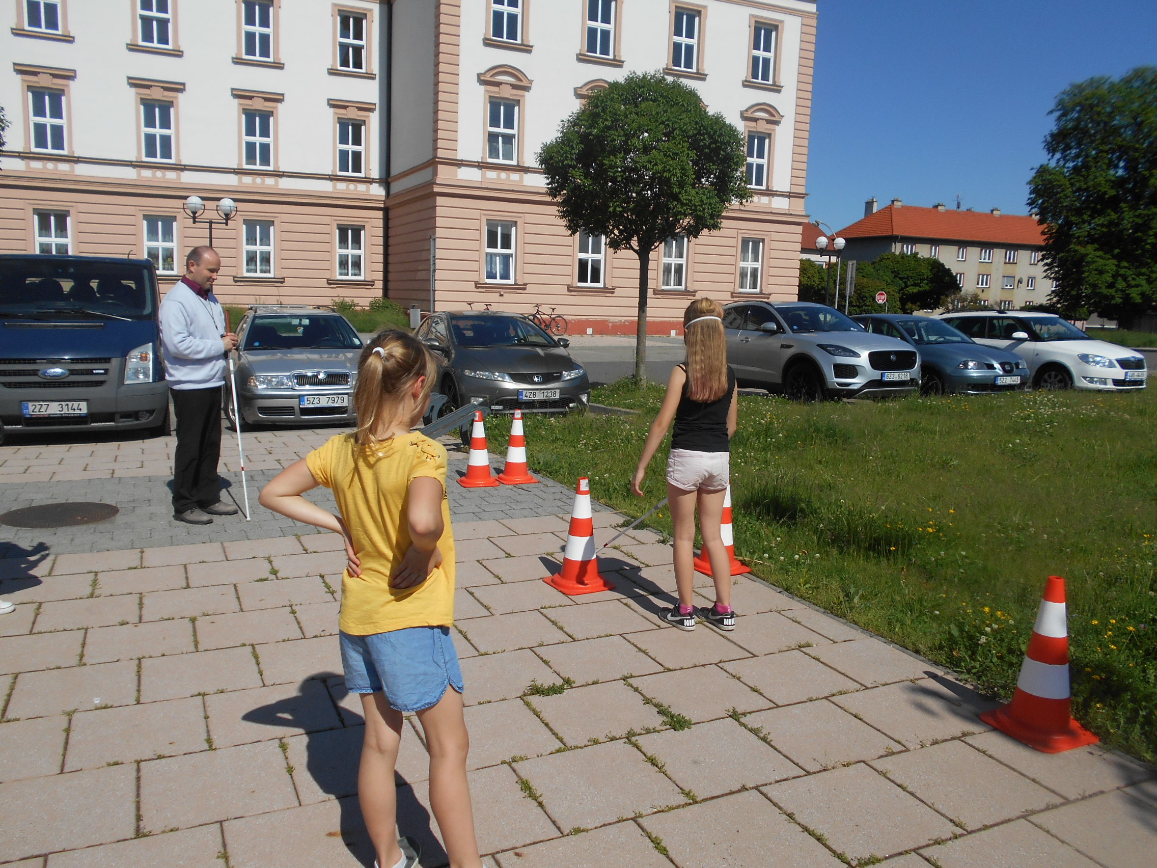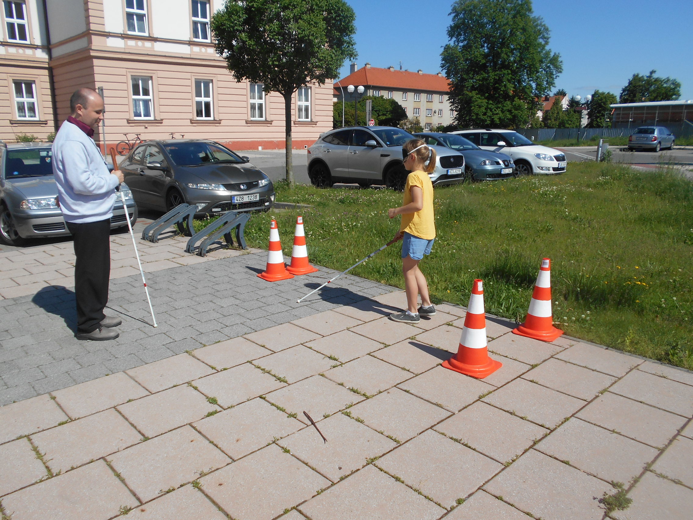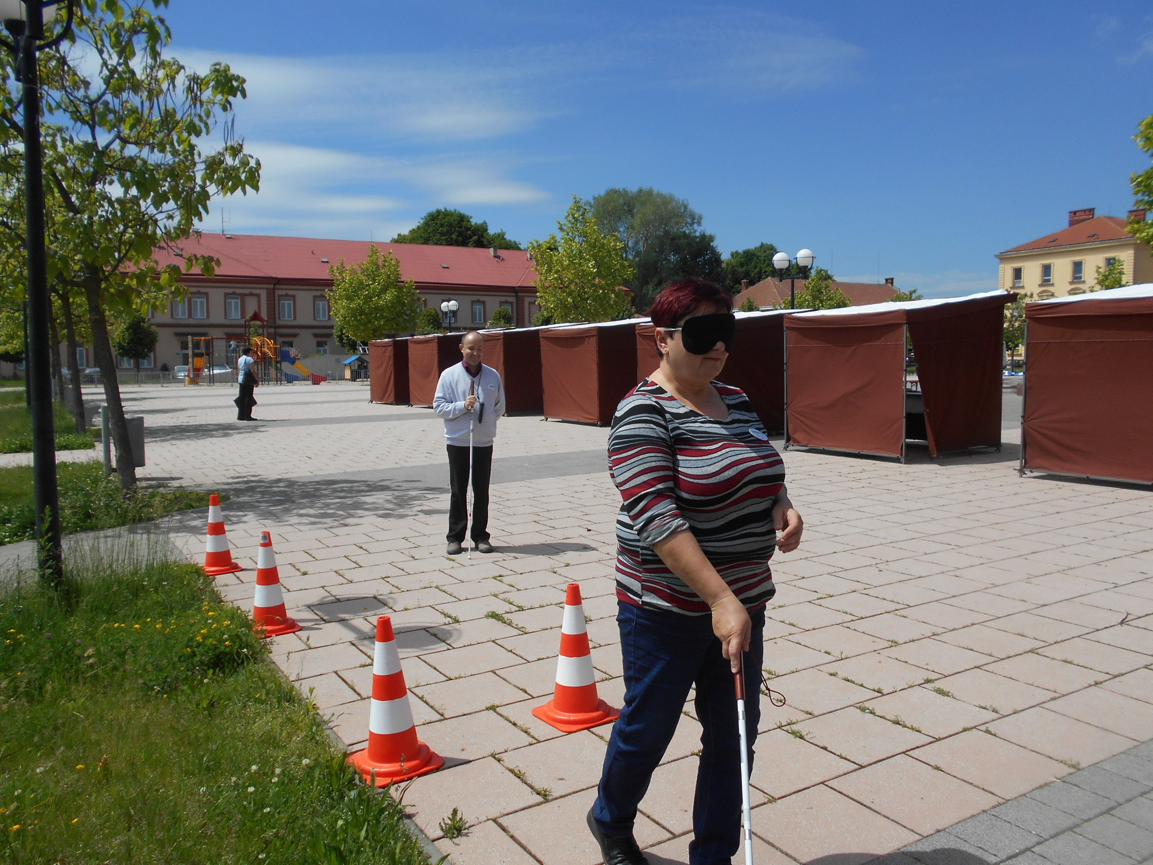 Náš stánek přilákal mimo dospělých i dětské návštěvníky, kteří si s velkým zájmem prohlédli vystavené pomůcky pro zrakově postižené usnadňující jejich každodenní činnosti, seznámili se s Braillovým bodovým písmem, s klapkami na očích si vyzkoušeli vlastnoruční podpis s využitím rámečku a hmatem rozpoznávali haptické obrázky. Velkým lákadlem pro ně byla chodecká dráha s překážkami, na které si vyzkoušeli techniky prostorové orientace a chůzi s bílou holí.