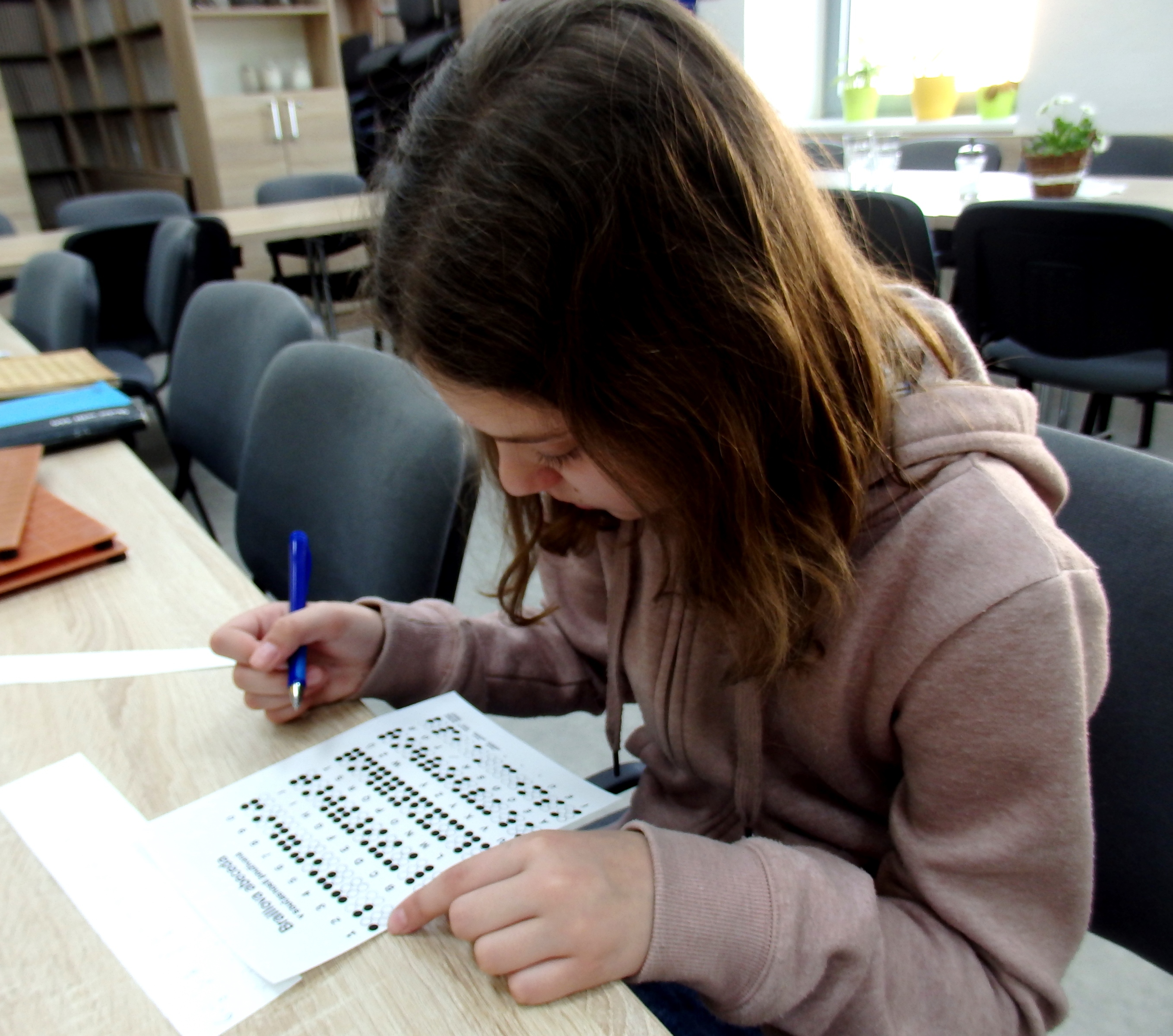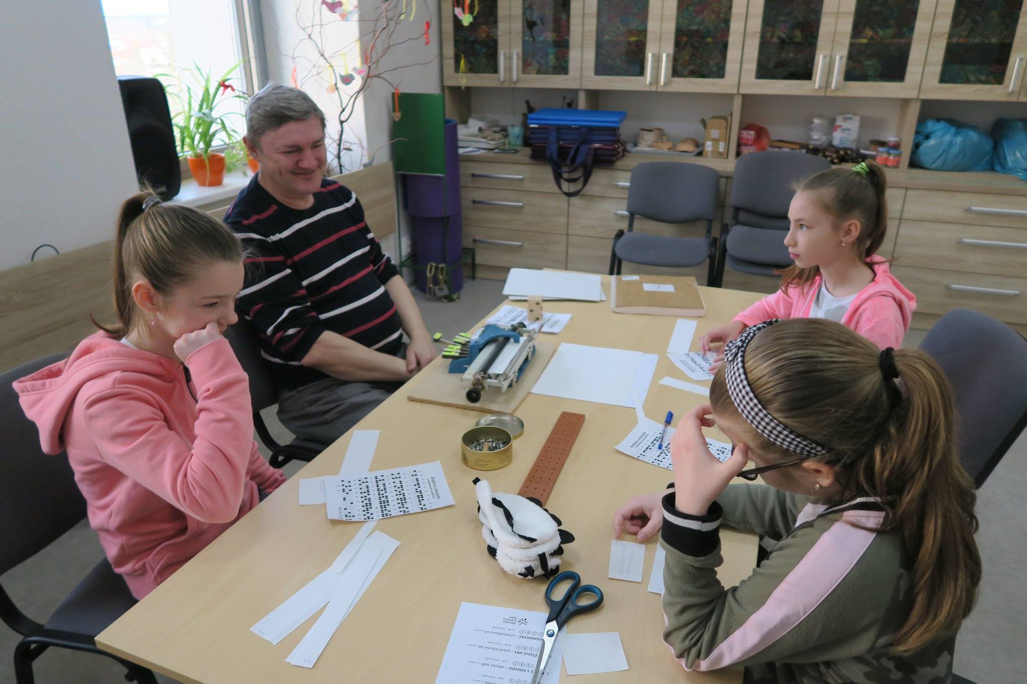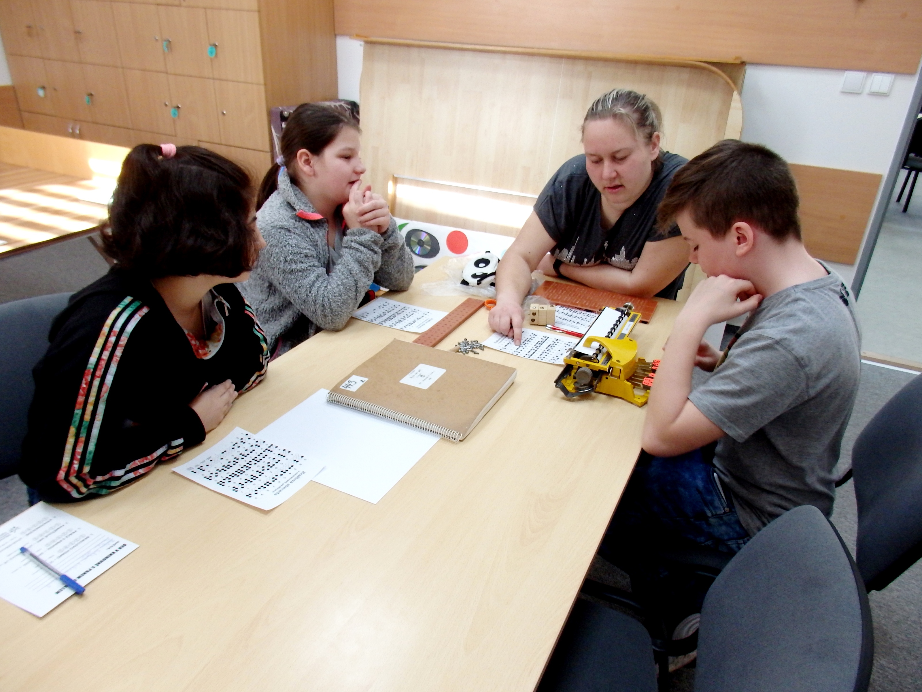 Žáci měli ve skupinám pracovat na několika stanovištích, vše bylo zaměřené na vnímání smyslů a knihu. V našem oddělení se seznamovali s Braillovým písmem, zkoušely si ho psát, číst. V závěru minilekce měli za úkol rozluštit nápis, který skrýval název knihy, kterou pak následně hledali v dětském oddělení. Opět jedna ze smysluplných aktivit v rámci osvěty ze života zrakově postižených.