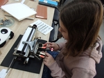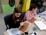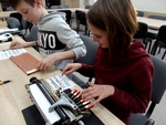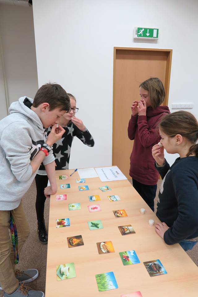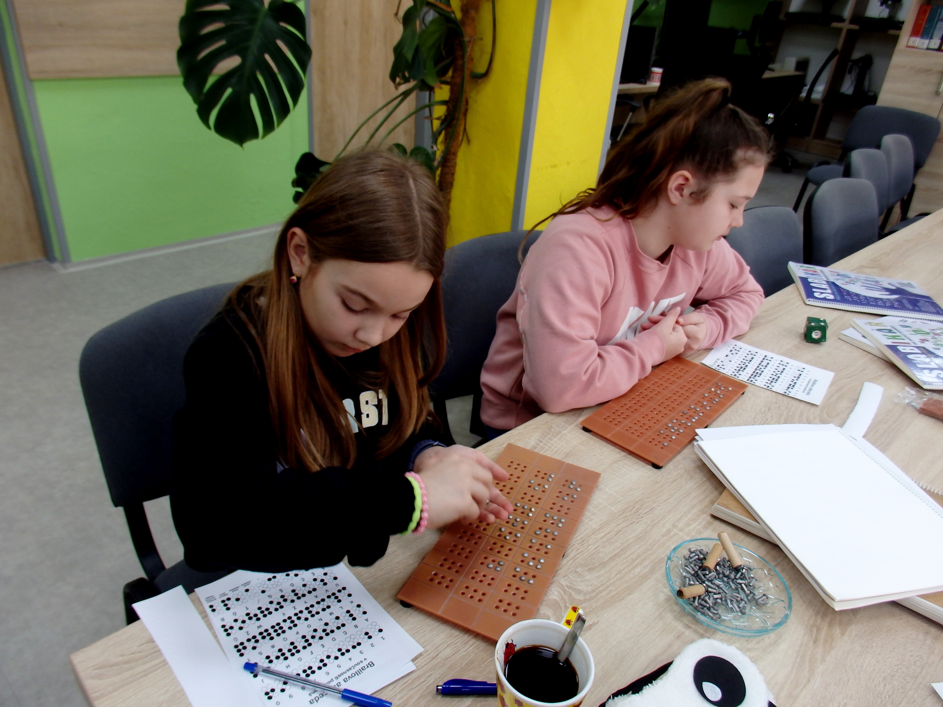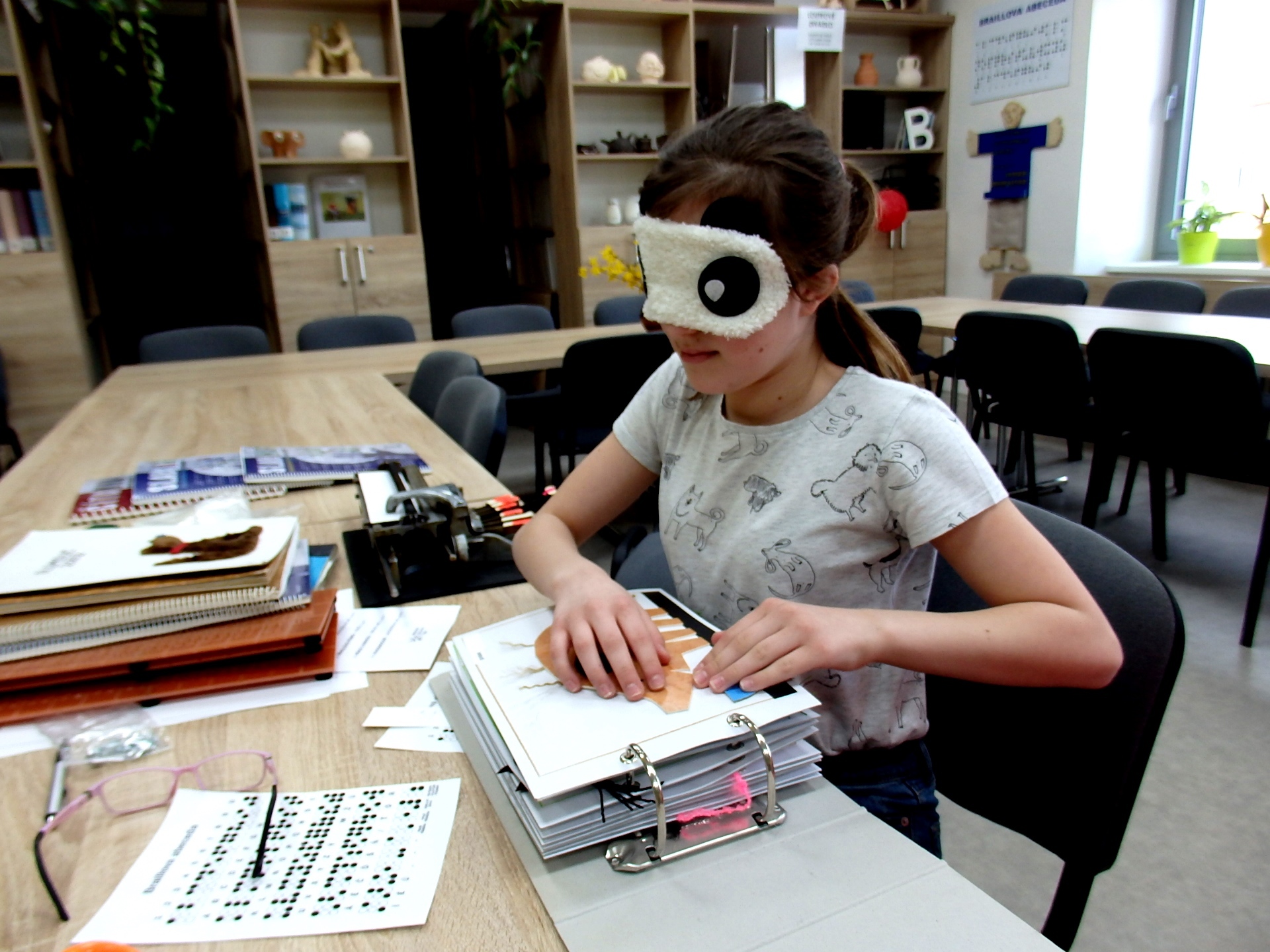 Žáci měli ve skupinám pracovat na několika stanovištích, vše bylo zaměřené na vnímání smyslů a knihu. V našem oddělení se seznamovali s Braillovým písmem, zkoušely si ho psát, číst. V závěru minilekce měli za úkol rozluštit nápis, který skrýval název knihy, kterou pak následně hledali v dětském oddělení. Opět jedna ze smysluplných aktivit v rámci osvěty ze života zrakově postižených.