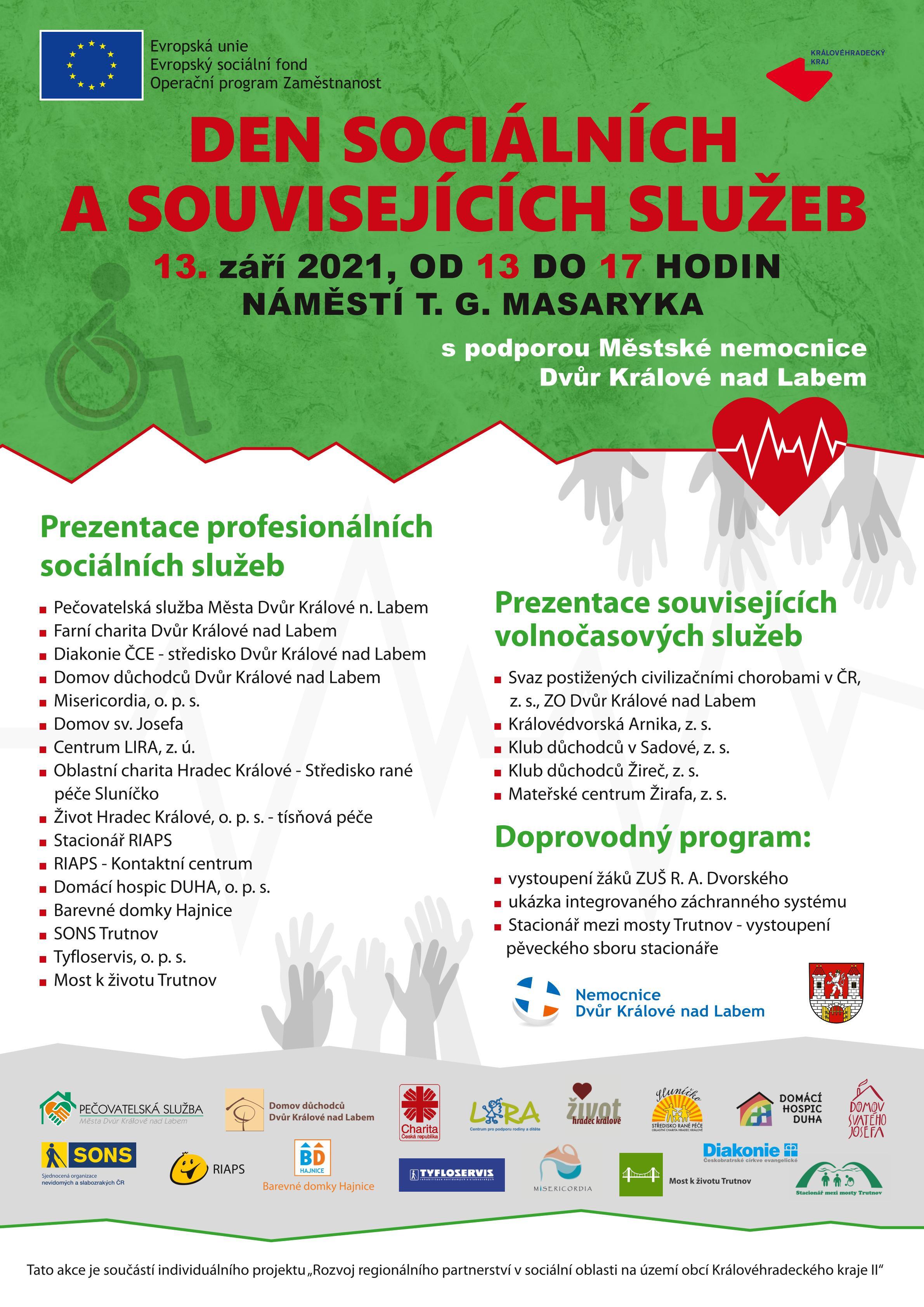 Přijďte se podívat na prezentaci sociálních služeb působících ve Dvoře Králové nad Labem a okolí. Dne 13.9.2021 od 13 do 17 hod se Vám představí jednotlivé služby na Náměstí T.G.Masaryka. Nebude chybět ani doprovodný program.