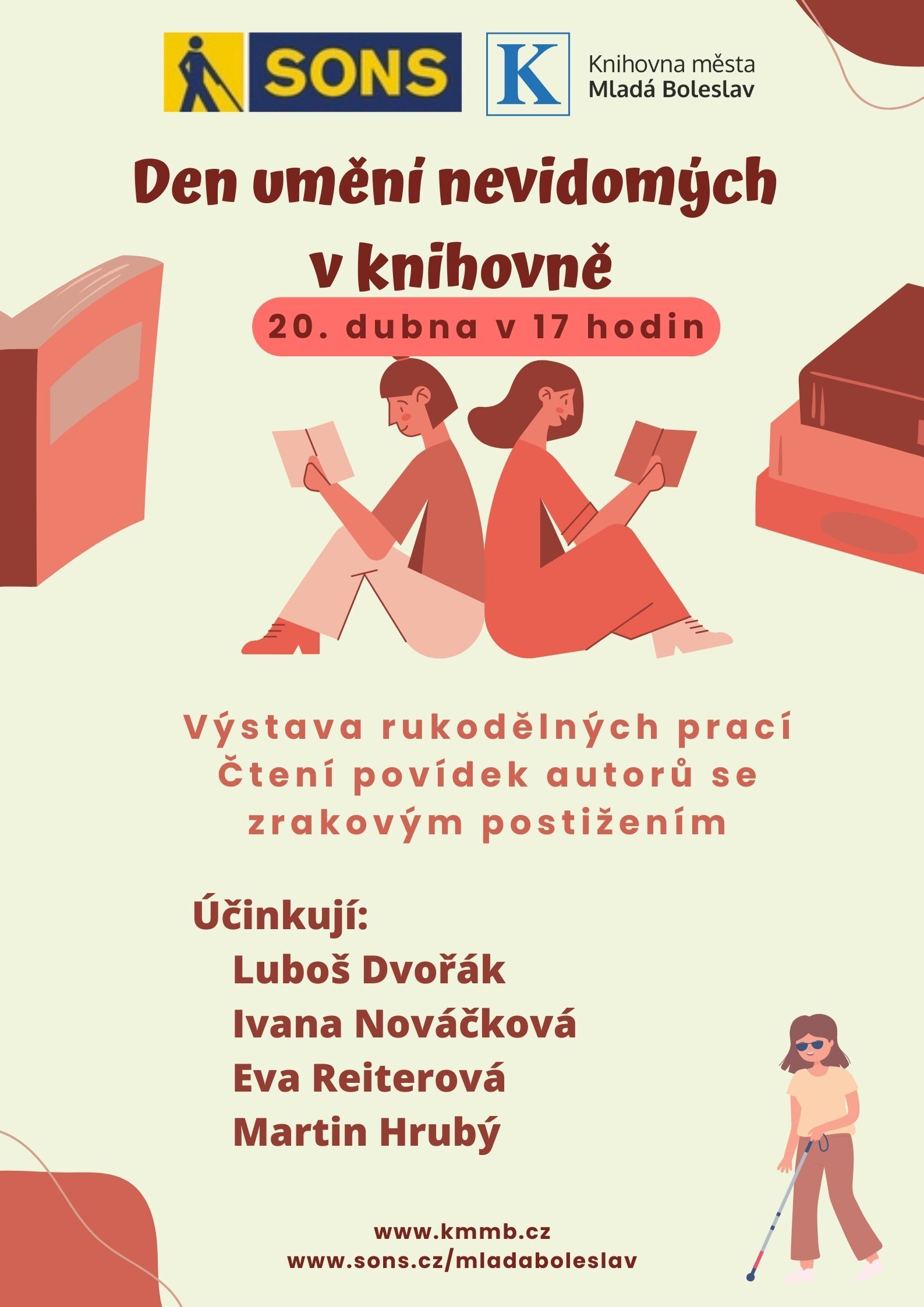 Dne 20. 4. 2023 od 17:00 proběhne v prostorách Knihovny města Mladá Boleslav akce se čtením povídek zrakově postiženého autora a výstavou rukodělných prací osob se zrakovým handicapem. V rámci akce bude možno si vyzkoušet simulační brýle a prohlédnout si některé pomůcky.