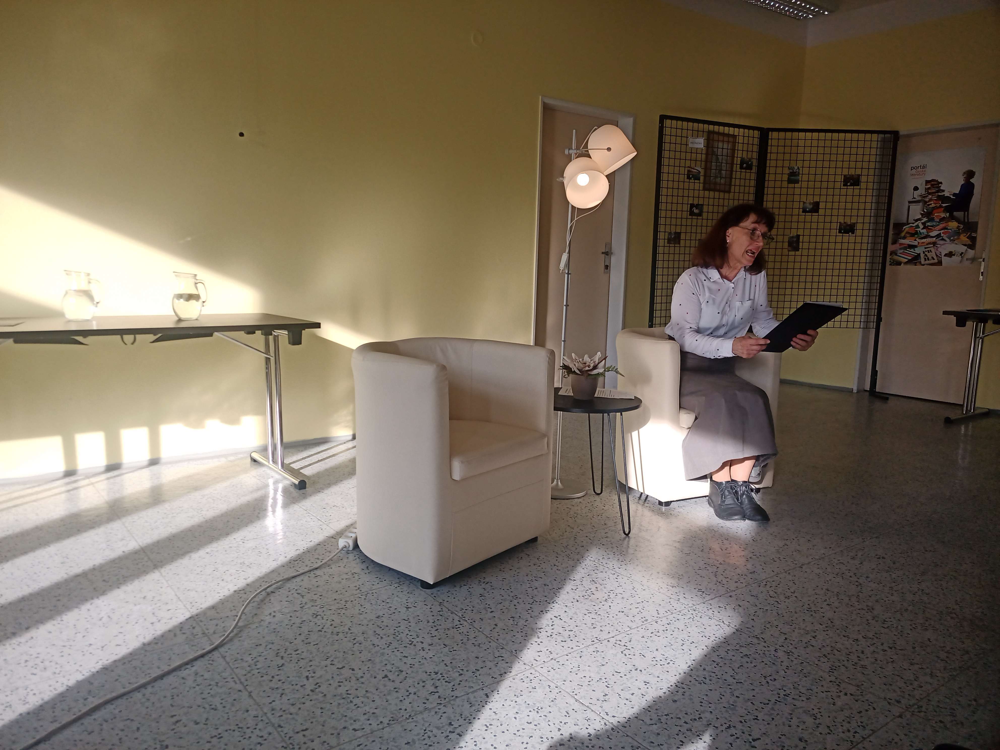 A co bylo k vidění a slyšení? Krásné rukodělné výrobky zrakově postižených členek odbočky. Především pletené a háčkované dečky, šály, nákrčníky, teplé ponožky a chňapky. Dále pak ručně vyrobená taška, ozdoby z porcelánu a na cestách pořízené fotografické pokusy. Též pohlednice vytvořené zrakově postiženým umělcem. Celé odpoledne provázela četba povídek zrakově postiženého autora. S touto četbou vypomohli právě herci mladoboleslavského divadla.